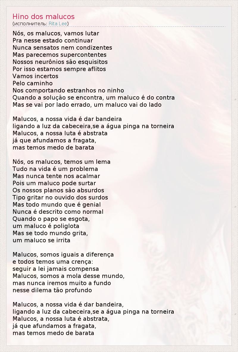 Нос, OS malucos , Vamos lutar Пра Несс Estado Продолжать NUNCA sensatos NEM condizentes Mas parecemos supercontentes Nossos neurônios Сан- esquisitos Por ISSO estamos Semper aflitos Vamos incertos Pelo Caminho Нос comportando estranhos не Ninho Quandosolução себе encontra , гм maluco é сделать противопоказания Mas себе вай POR Ладо errado , гм maluco вай Do Ладо Malucos ,Носа Vida é Дар Bandeira LigandoЛус да cabeceira , SEágua пинга на torneira Malucos ,Носа Лута é abstrata já Que afundamosFragata , Рождество temos Мидо -де- Barata Нос, OS malucos , temos мкм Лема TUDO Na Vida é мкм проблема- Mas Nunca разрядки NOS acalmar Pois мкм maluco Поде surtar Os nossos Планос Сан- absurdos Типо не gritar не ouvido DOS surdos Mas TODO Mundo Que é гениальный NUNCA é descrito Комо нормально Quando о Папо себе esgota , гм maluco é poliglota Mas себе TODO Mundo Grita , гм maluco себе irrita Malucos , Somos iguaisDiferença е ToDos temos Ума crença : seguirлеев Жамэ Compensa Malucos , Somosмола desse Mundo , Рождество Nunca iremos MuitoFundo Несс Дилема Тао глубокобедренно Malucos ,Носа Vida é Дар Bandeira , LigandoЛус да cabeceira , SEágua пинга на torneira Malucos ,Носа Лута é abstrata , já Que afundamosFragata , Рождество temos Мидо -де- Barata