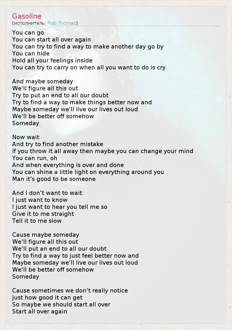 Ты можешь идти, Можешь начинать все сначала, Заставлять себя жить дальше, Можешь прятать свои чувства, Держать их внутри, Можешь попробовать жить дальше, когда хочется плакать И, может, когда-нибудь Мы все поймем И попытаемся положить конец всем нашим сомнениям, Попытаемся исправить что-то и Может когда-нибудь мы заживем на широкую ногу И наша жизнь улучшится как-нибудь, Когда-нибудь Теперь остановись И попытайся найти еще одну ошибку, Если ты все это выкинешь из головы, может быть,ты передумаешь, Ты можешь бежать,оо И когда все закончится, Ты осветишь все вокруг себя, Эй, так хорошо кем-то быть Я не хочу ждать, Я только хочу знать, Хочу услышать, как ты мне это скажешь, Скажи мне это прямо Скажи мне это медленно Потому что, может, когда-нибудь Мы все поймем И попытаемся положить конец всем нашим сомнениям, Попытаемся исправить что-то и Может когда-нибудь мы заживем на широкую ногу И наша жизнь улучшится как-нибудь, Когда-нибудь Потому что иногда мы не замечаем, Как прекрасна может быть жизнь, Так может нам стоит начать все сначала, Начать все сначала