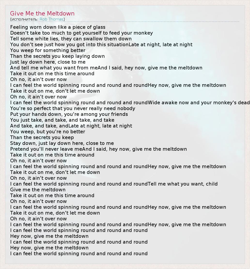 Feeling worn down like a piece of glass Doesn't take too much to get yourself to feed your monkey Tell some white lies, they can swallow them down You don't see just how you got into this situationLate at night, late at night You weep for something better Than the secrets you keep laying down Just lay down here, close to me And tell me what you want from meAnd I said, hey now, give me the meltdown Take it out on me this time around Oh no, it ain't over now I can feel the world spinning round and round and roundHey now, give me the meltdown Take it out on me, don't let me down Oh no, it ain't over now I can feel the world spinning round and round and roundWide awake now and your monkey's dead You're so perfect that you never really need nobody Put your hands down, you're among your friends You just take, and take, and take, and take And take, and take, andLate at night, late at night You weep, but you're no better Than the secrets you keep Stay down, just lay down here, close to me Pretend you'll never leave meAnd I said, hey now, give me the meltdown Take it out on me this time around Oh no, it ain't over now I can feel the world spinning round and round and roundHey now, give me the meltdown Take it out on me, don't let me down Oh no, it ain't over now I can feel the world spinning round and round and roundTell me what you want, child Give me the meltdown Take it out on me this time around Oh no, it ain't over now I can feel the world spinning round and round and roundHey now, give me the meltdown Take it out on me, don't let me down Oh no, it ain't over now I can feel the world spinning round and round and roundHey now, give me the meltdown I can feel the world spinning round and round and round Hey now, give me the meltdown I can feel the world spinning round and round and round Hey now, give me the meltdown I can feel the world spinning round and round and round