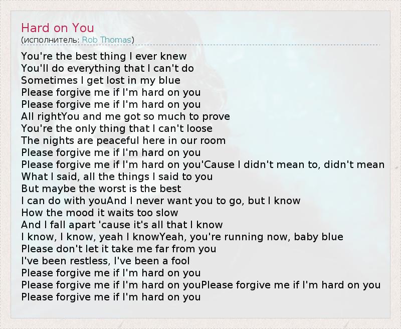 You're the best thing I ever knew You'll do everything that I can't do Sometimes I get lost in my blue Please forgive me if I'm hard on you Please forgive me if I'm hard on you All rightYou and me got so much to prove You're the only thing that I can't loose The nights are peaceful here in our room Please forgive me if I'm hard on you Please forgive me if I'm hard on you'Cause I didn't mean to, didn't mean What I said, all the things I said to you But maybe the worst is the best I can do with youAnd I never want you to go, but I know How the mood it waits too slow And I fall apart 'cause it's all that I know I know, I know, yeah I knowYeah, you're running now, baby blue Please don't let it take me far from you I've been restless, I've been a fool Please forgive me if I'm hard on you Please forgive me if I'm hard on youPlease forgive me if I'm hard on you Please forgive me if I'm hard on you