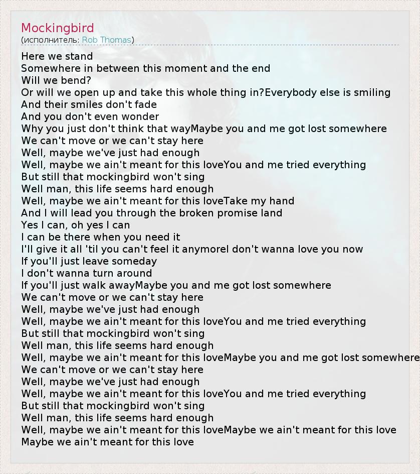 Here we stand Somewhere in between this moment and the end Will we bend? Or will we open up and take this whole thing in?Everybody else is smiling And their smiles don't fade And you don't even wonder Why you just don't think that wayMaybe you and me got lost somewhere We can't move or we can't stay here Well, maybe we've just had enough Well, maybe we ain't meant for this loveYou and me tried everything But still that mockingbird won't sing Well man, this life seems hard enough Well, maybe we ain't meant for this loveTake my hand And I will lead you through the broken promise land Yes I can, oh yes I can I can be there when you need it I'll give it all 'til you can't feel it anymoreI don't wanna love you now If you'll just leave someday I don't wanna turn around If you'll just walk awayMaybe you and me got lost somewhere We can't move or we can't stay here Well, maybe we've just had enough Well, maybe we ain't meant for this loveYou and me tried everything But still that mockingbird won't sing Well man, this life seems hard enough Well, maybe we ain't meant for this loveMaybe you and me got lost somewhere We can't move or we can't stay here Well, maybe we've just had enough Well, maybe we ain't meant for this loveYou and me tried everything But still that mockingbird won't sing Well man, this life seems hard enough Well, maybe we ain't meant for this loveMaybe we ain't meant for this love Maybe we ain't meant for this love
