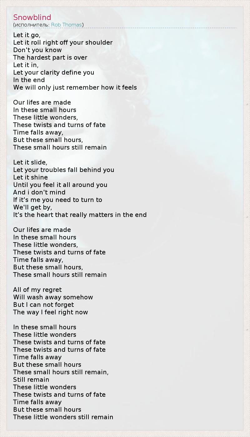 Let it go, Let it roll right off your shoulder Don't you know The hardest part is over Let it in, Let your clarity define you In the end We will only just remember how it feels Our lifes are made In these small hours These little wonders, These twists and turns of fate Time falls away, But these small hours, These small hours still remain Let it slide, Let your troubles fall behind you Let it shine Until you feel it all around you And i don't mind If it's me you need to turn to We'll get by, It's the heart that really matters in the end Our lifes are made In these small hours These little wonders, These twists and turns of fate Time falls away, But these small hours, These small hours still remain All of my regret Will wash away somehow But I can not forget The way I feel right now In these small hours These little wonders These twists and turns of fate These twists and turns of fate Time falls away But these small hours These small hours still remain, Still remain These little wonders These twists and turns of fate Time falls away But these small hours These little wonders still remain