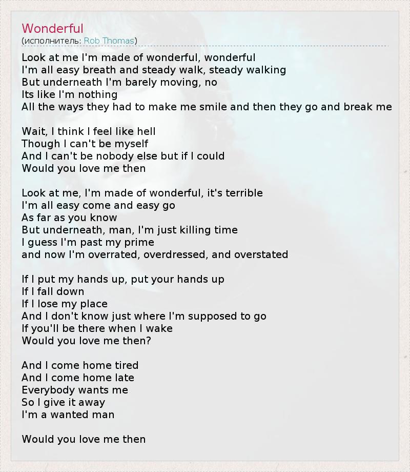 Look at me I'm made of wonderful, wonderful I'm all easy breath and steady walk, steady walking But underneath I'm barely moving, no Its like I'm nothing All the ways they had to make me smile and then they go and break me Wait, I think I feel like hell Though I can't be myself And I can't be nobody else but if I could Would you love me then Look at me, I'm made of wonderful, it's terrible I'm all easy come and easy go As far as you know But underneath, man, I'm just killing time I guess I'm past my prime and now I'm overrated, overdressed, and overstated If I put my hands up, put your hands up If I fall down If I lose my place And I don't know just where I'm supposed to go If you'll be there when I wake Would you love me then? And I come home tired And I come home late Everybody wants me So I give it away I'm a wanted man Would you love me then
