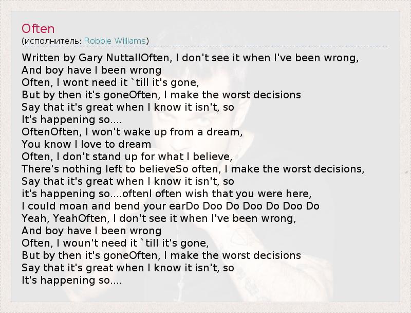 Written by Gary NuttallOften, I don't see it when I've been wrong, And boy have I been wrong Often, I wont need it `till it's gone, But by then it's goneOften, I make the worst decisions Say that it's great when I know it isn't, so It's happening so.... OftenOften, I won't wake up from a dream, You know I love to dream Often, I don't stand up for what I believe, There's nothing left to believeSo often, I make the worst decisions, Say that it's great when I know it isn't, so it's happening so....oftenI often wish that you were here, I could moan and bend your earDo Doo Do Doo Do Doo Do Yeah, YeahOften, I don't see it when I've been wrong, And boy have I been wrong Often, I woun't need it `till it's gone, But by then it's goneOften, I make the worst decisions Say that it's great when I know it isn't, so It's happening so....