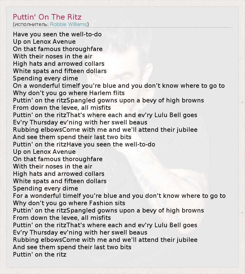 Have you seen the well-to-do Up on Lenox Avenue On that famous thoroughfare With their noses in the air High hats and arrowed collars White spats and fifteen dollars Spending every dime On a wonderful timeIf you're blue and you don't know where to go to Why don't you go where Harlem flits Puttin' on the ritzSpangled gowns upon a bevy of high browns From down the levee, all misfits Puttin' on the ritzThat's where each and ev'ry Lulu Bell goes Ev'ry Thursday ev'ning with her swell beaus Rubbing elbowsCome with me and we'll attend their jubilee And see them spend their last two bits Puttin' on the ritzHave you seen the well-to-do Up on Lenox Avenue On that famous thoroughfare With their noses in the air High hats and arrowed collars White spats and fifteen dollars Spending every dime For a wonderful timeIf you're blue and you don't know where to go to Why don't you go where Fashion sits Puttin' on the ritzSpangled gowns upon a bevy of high browns From down the levee, all misfits Puttin' on the ritzThat's where each and ev'ry Lulu Bell goes Ev'ry Thursday ev'ning with her swell beaus Rubbing elbowsCome with me and we'll attend their jubilee And see them spend their last two bits Puttin' on the ritz