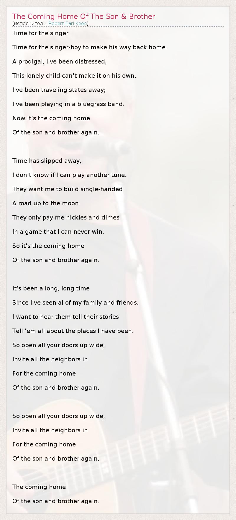 Time for the singer Time for the singer-boy to make his way back home. A prodigal, I've been distressed, This lonely child can't make it on his own. I've been traveling states away; I've been playing in a bluegrass band. Now it's the coming home Of the son and brother again. Time has slipped away, I don't know if I can play another tune. They want me to build single-handed A road up to the moon. They only pay me nickles and dimes In a game that I can never win. So it's the coming home Of the son and brother again. It's been a long, long time Since I've seen al of my family and friends. I want to hear them tell their stories Tell 'em all about the places I have been. So open all your doors up wide, Invite all the neighbors in For the coming home Of the son and brother again. So open all your doors up wide, Invite all the neighbors in For the coming home Of the son and brother again. The coming home Of the son and brother again.
