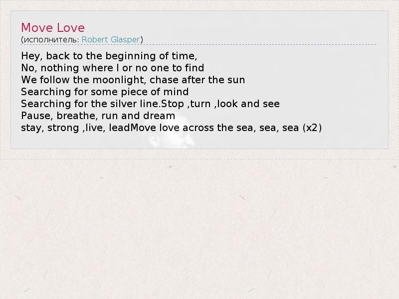 Hey, back to the beginning of time, No, nothing where I or no one to find We follow the moonlight, chase after the sun Searching for some piece of mind Searching for the silver line.Stop ,turn ,look and see Pause, breathe, run and dream stay, strong ,live, leadMove love across the sea, sea, sea (x2)