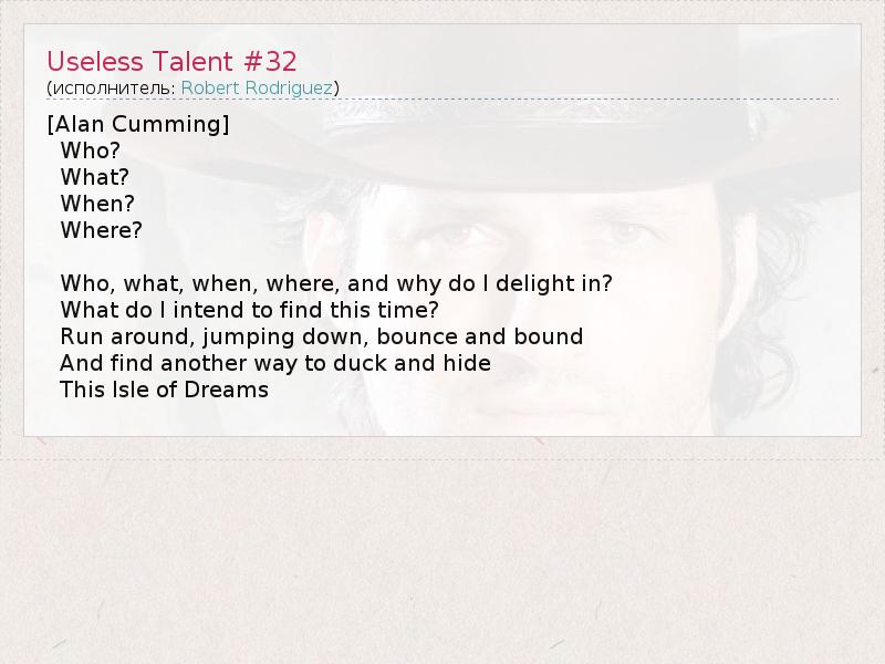 [Alan Cumming] Who? What? When? Where? Who, what, when, where, and why do I delight in? What do I intend to find this time? Run around, jumping down, bounce and bound And find another way to duck and hide This Isle of Dreams