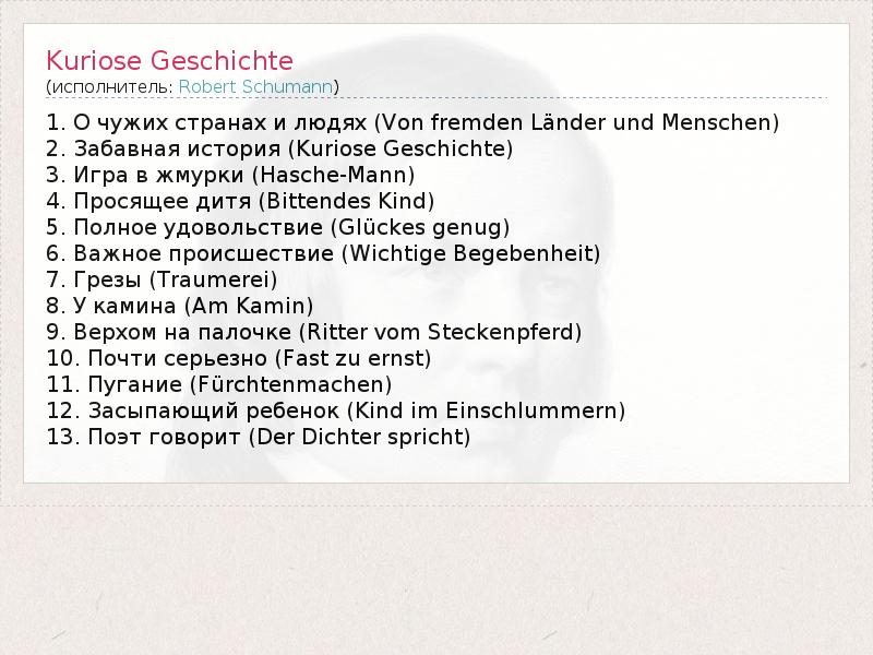 Это интересно:Роберт Шуман (нем. Robert Schumann; 8 июня 1810, Цвиккау — 29 июля 1856) — немецкий композитор и пианист. Один из самых известных композиторов-романтиков первой половины XIX века.Родился Шуман в семье книгоиздателя. С детства проявились способности и литературные и музыкальные. До 16 лет Шуман не мог выбрать между музыкой и литературой. Учился в гимназии, сочинял стихи, писал комедии, драмы. Изучал... продолжение