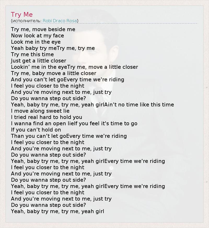 Try me, move beside me Now look at my face Look me in the eye Yeah baby try meTry me, try me Try me this time Just get a little closer Lookin' me in the eyeTry me, move a little closer Try me, baby move a little closer And you can't let goEvery time we're riding I feel you closer to the night And you're moving next to me, just try Do you wanna step out side? Yeah, baby try me, try me, yeah girlAin't no time like this time I move along sweet lie I tried real hard to hold you I wanna find an open lieIf you feel it's time to go If you can't hold on Than you can't let goEvery time we're riding I feel you closer to the night And you're moving next to me, just try Do you wanna step out side? Yeah, baby try me, try me, yeah girlEvery time we're riding I feel you closer to the night And you're moving next to me, just try Do you wanna step out side? Yeah, baby try me, try me, yeah girlEvery time we're riding I feel you closer to the night And you're moving next to me, just try Do you wanna step out side? Yeah, baby try me, try me, yeah girl