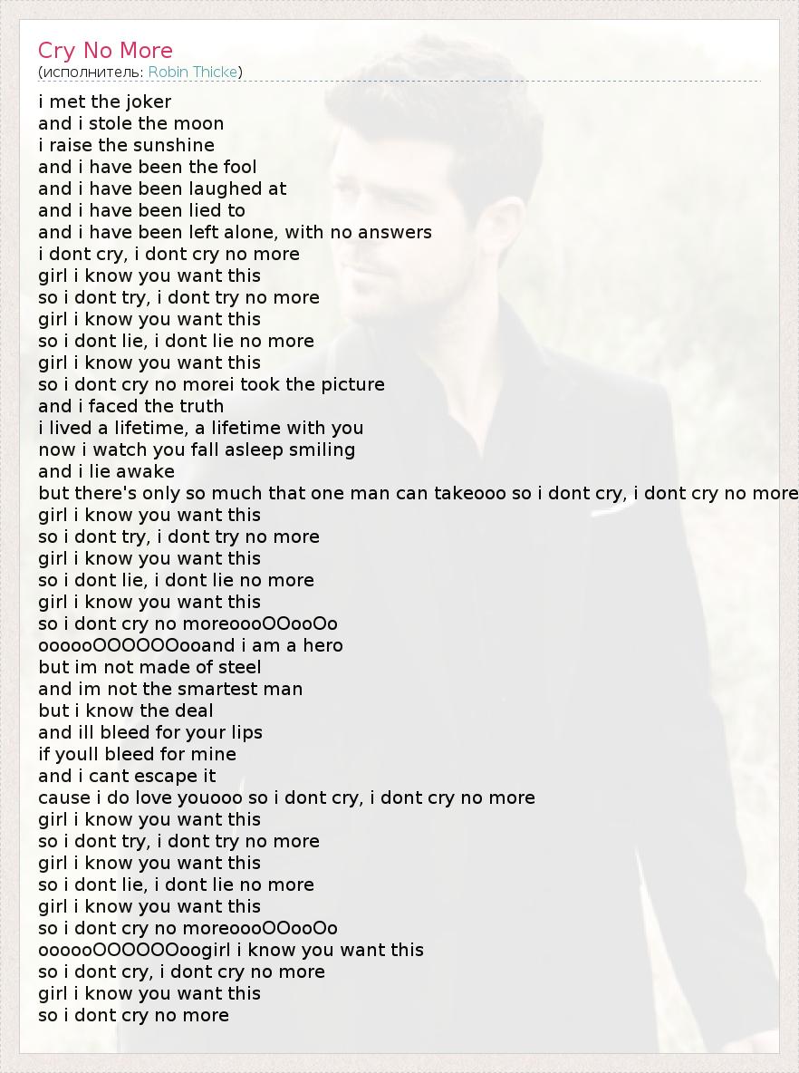 i met the joker and i stole the moon i raise the sunshine and i have been the fool and i have been laughed at and i have been lied to and i have been left alone, with no answers i dont cry, i dont cry no more girl i know you want this so i dont try, i dont try no more girl i know you want this so i dont lie, i dont lie no more girl i know you want this so i dont cry no morei took the picture and i faced the truth i lived a lifetime, a lifetime with you now i watch you fall asleep smiling and i lie awake but there's only so much that one man can takeooo so i dont cry, i dont cry no more girl i know you want this so i dont try, i dont try no more girl i know you want this so i dont lie, i dont lie no more girl i know you want this so i dont cry no moreoooOOooOo oooooOOOOOOooand i am a hero but im not made of steel and im not the smartest man but i know the deal and ill bleed for your lips if youll bleed for mine and i cant escape it cause i do love youooo so i dont cry, i dont cry no more girl i know you want this so i dont try, i dont try no more girl i know you want this so i dont lie, i dont lie no more girl i know you want this so i dont cry no moreoooOOooOo oooooOOOOOOoogirl i know you want this so i dont cry, i dont cry no more girl i know you want this so i dont cry no more
