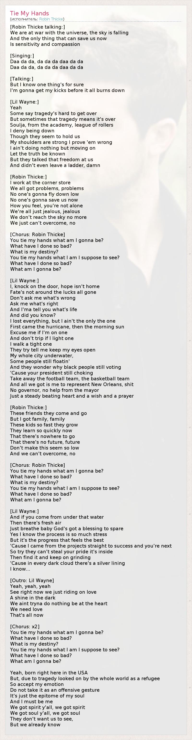 А как ты думаешь, о чем песня "Tie My Hands" ?