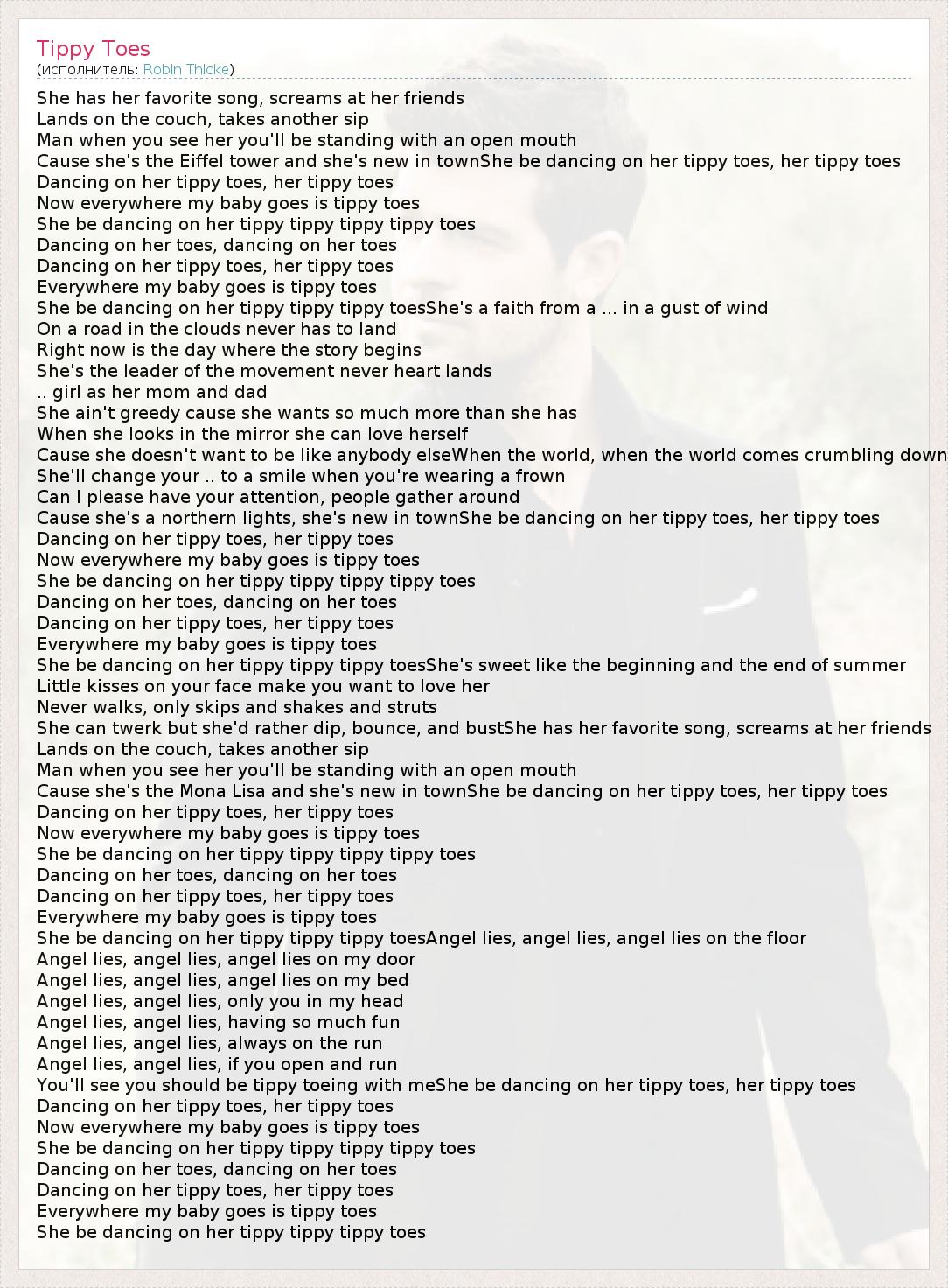 She has her favorite song, screams at her friends Lands on the couch, takes another sip Man when you see her you'll be standing with an open mouth Cause she's the Eiffel tower and she's new in townShe be dancing on her tippy toes, her tippy toes Dancing on her tippy toes, her tippy toes Now everywhere my baby goes is tippy toes She be dancing on her tippy tippy tippy tippy toes Dancing on her toes, dancing on her toes Dancing on her tippy toes, her tippy toes Everywhere my baby goes is tippy toes She be dancing on her tippy tippy tippy toesShe's a faith from a ... in a gust of wind On a road in the clouds never has to land Right now is the day where the story begins She's the leader of the movement never heart lands .. girl as her mom and dad She ain't greedy cause she wants so much more than she has When she looks in the mirror she can love herself Cause she doesn't want to be like anybody elseWhen the world, when the world comes crumbling down She'll change your .. to a smile when you're wearing a frown Can I please have your attention, people gather around Cause she's a northern lights, she's new in townShe be dancing on her tippy toes, her tippy toes Dancing on her tippy toes, her tippy toes Now everywhere my baby goes is tippy toes She be dancing on her tippy tippy tippy tippy toes Dancing on her toes, dancing on her toes Dancing on her tippy toes, her tippy toes Everywhere my baby goes is tippy toes She be dancing on her tippy tippy tippy toesShe's sweet like the beginning and the end of summer Little kisses on your face make you want to love her Never walks, only skips and shakes and struts She can twerk but she'd rather dip, bounce, and bustShe has her favorite song, screams at her friends Lands on the couch, takes another sip Man when you see her you'll be standing with an open mouth Cause she's the Mona Lisa and she's new in townShe be dancing on her tippy toes, her tippy toes Dancing on her tippy toes, her tippy toes Now everywhere my baby goes is tippy toes She be dancing on her tippy tippy tippy tippy toes Dancing on her toes, dancing on her toes Dancing on her tippy toes, her tippy toes Everywhere my baby goes is tippy toes She be dancing on her tippy tippy tippy toesAngel lies, angel lies, angel lies on the floor Angel lies, angel lies, angel lies on my door Angel lies, angel lies, angel lies on my bed Angel lies, angel lies, only you in my head Angel lies, angel lies, having so much fun Angel lies, angel lies, always on the run Angel lies, angel lies, if you open and run You'll see you should be tippy toeing with meShe be dancing on her tippy toes, her tippy toes Dancing on her tippy toes, her tippy toes Now everywhere my baby goes is tippy toes She be dancing on her tippy tippy tippy tippy toes Dancing on her toes, dancing on her toes Dancing on her tippy toes, her tippy toes Everywhere my baby goes is tippy toes She be dancing on her tippy tippy tippy toes