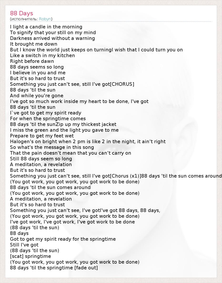 Something you just can't see, still I've got[Chorus (x1)]88 days 'til the sun comes around