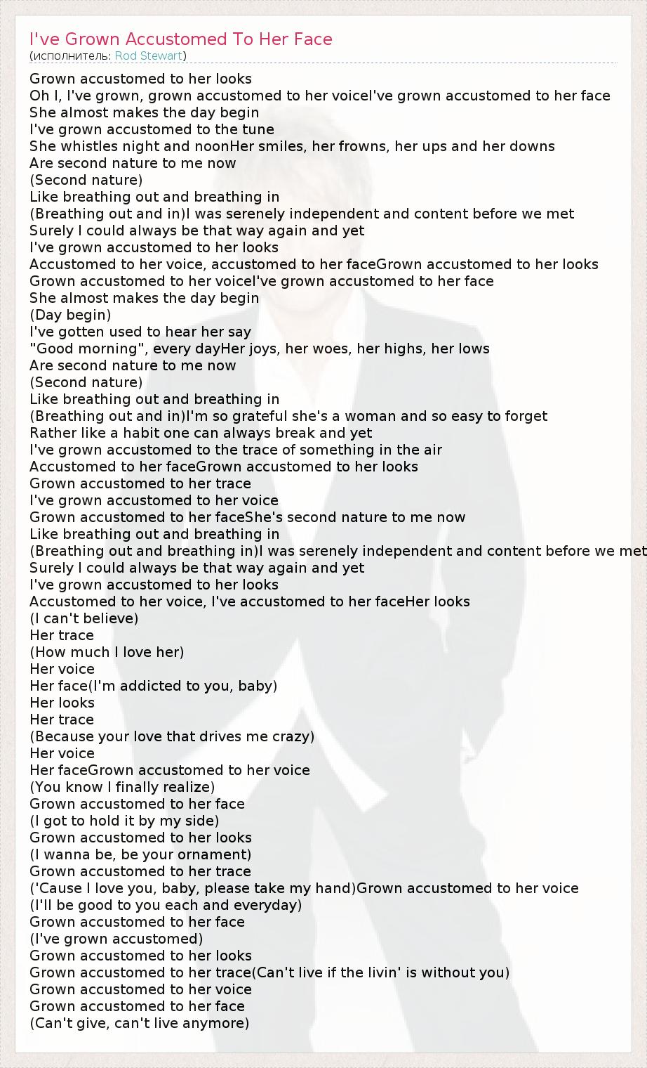 Oh I, I've grown, grown accustomed to her voiceI've grown accustomed to her face
