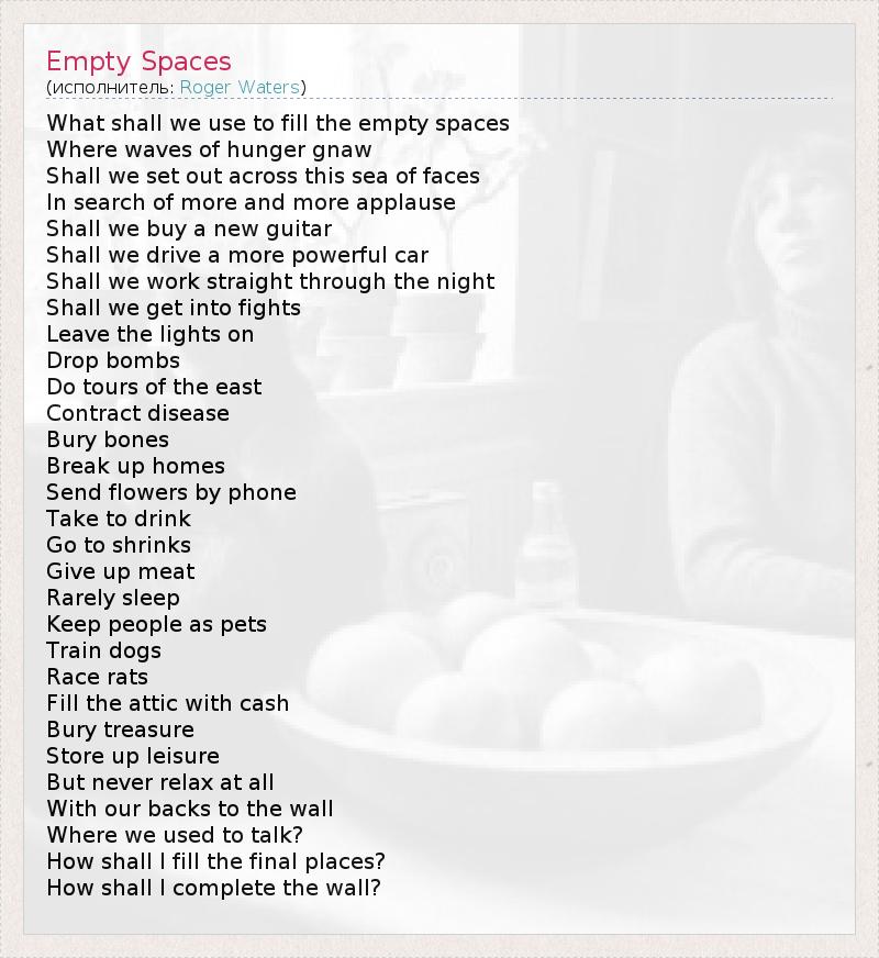 What shall we use to fill the empty spaces Where waves of hunger gnaw Shall we set out across this sea of faces In search of more and more applause Shall we buy a new guitar Shall we drive a more powerful car Shall we work straight through the night Shall we get into fights Leave the lights on Drop bombs Do tours of the east Contract disease Bury bones Break up homes Send flowers by phone Take to drink Go to shrinks Give up meat Rarely sleep Keep people as pets Train dogs Race rats Fill the attic with cash Bury treasure Store up leisure But never relax at all With our backs to the wall Where we used to talk? How shall I fill the final places? How shall I complete the wall?