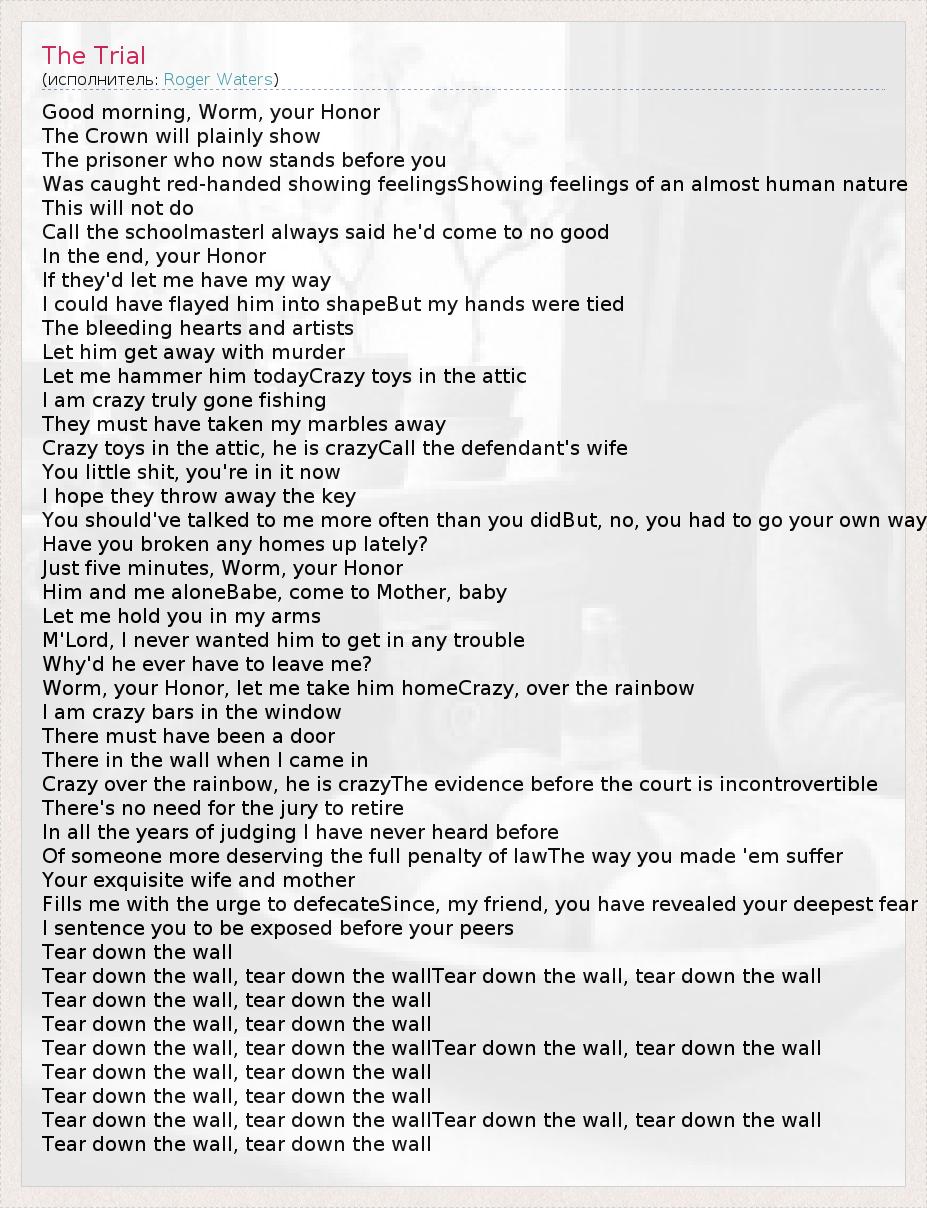 Good morning, Worm, your Honor The Crown will plainly show The prisoner who now stands before you Was caught red-handed showing feelingsShowing feelings of an almost human nature This will not do Call the schoolmasterI always said he'd come to no good In the end, your Honor If they'd let me have my way I could have flayed him into shapeBut my hands were tied The bleeding hearts and artists Let him get away with murder Let me hammer him todayCrazy toys in the attic I am crazy truly gone fishing They must have taken my marbles away Crazy toys in the attic, he is crazyCall the defendant's wife You little shit, you're in it now I hope they throw away the key You should've talked to me more often than you didBut, no, you had to go your own way Have you broken any homes up lately? Just five minutes, Worm, your Honor Him and me aloneBabe, come to Mother, baby Let me hold you in my arms M'Lord, I never wanted him to get in any trouble Why'd he ever have to leave me? Worm, your Honor, let me take him homeCrazy, over the rainbow I am crazy bars in the window There must have been a door There in the wall when I came in Crazy over the rainbow, he is crazyThe evidence before the court is incontrovertible There's no need for the jury to retire In all the years of judging I have never heard before Of someone more deserving the full penalty of lawThe way you made 'em suffer Your exquisite wife and mother Fills me with the urge to defecateSince, my friend, you have revealed your deepest fear I sentence you to be exposed before your peers Tear down the wall Tear down the wall, tear down the wallTear down the wall, tear down the wall Tear down the wall, tear down the wall Tear down the wall, tear down the wall Tear down the wall, tear down the wallTear down the wall, tear down the wall Tear down the wall, tear down the wall Tear down the wall, tear down the wall Tear down the wall, tear down the wallTear down the wall, tear down the wall Tear down the wall, tear down the wall