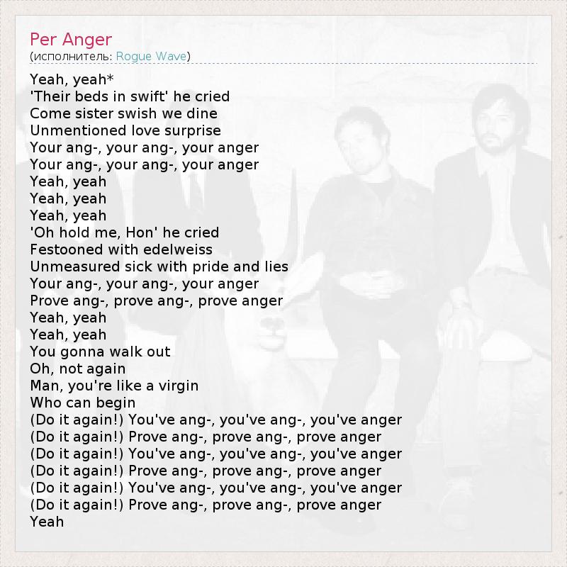 Yeah, yeah* 'Their beds in swift' he cried Come sister swish we dine Unmentioned love surprise Your ang-, your ang-, your anger Your ang-, your ang-, your anger Yeah, yeah Yeah, yeah Yeah, yeah 'Oh hold me, Hon' he cried Festooned with edelweiss Unmeasured sick with pride and lies Your ang-, your ang-, your anger Prove ang-, prove ang-, prove anger Yeah, yeah Yeah, yeah You gonna walk out Oh, not again Man, you're like a virgin Who can begin (Do it again!) You've ang-, you've ang-, you've anger (Do it again!) Prove ang-, prove ang-, prove anger (Do it again!) You've ang-, you've ang-, you've anger (Do it again!) Prove ang-, prove ang-, prove anger (Do it again!) You've ang-, you've ang-, you've anger (Do it again!) Prove ang-, prove ang-, prove anger Yeah