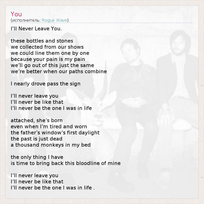 I'll Never Leave You. these bottles and stones we collected from our shows we could line them one by one because your pain is my pain we’ll go out of this just the same we’re better when our paths combine I nearly drove pass the sign I’ll never leave you I’ll never be like that I’ll never be the one I was in life attached, she’s born even when I’m tired and worn the father’s window’s first daylight the past is just dead a thousand monkeys in my bed the only thing I have is time to bring back this bloodline of mine I’ll never leave you I’ll never be like that I’ll never be the one I was in life .