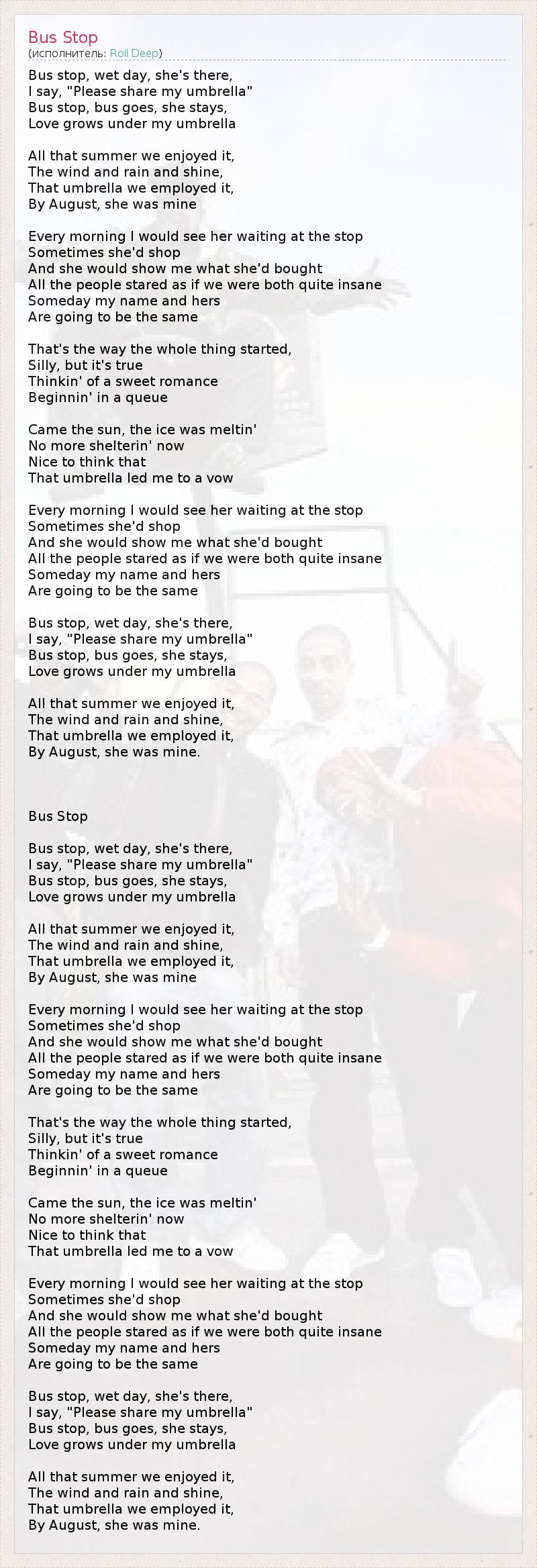Bus stop, wet day, she's there, I say, "Please share my umbrella" Bus stop, bus goes, she stays, Love grows under my umbrella All that summer we enjoyed it, The wind and rain and shine, That umbrella we employed it, By August, she was mine Every morning I would see her waiting at the stop Sometimes she'd shop And she would show me what she'd bought All the people stared as if we were both quite insane Someday my name and hers Are going to be the same That's the way the whole thing started, Silly, but it's true Thinkin' of a sweet romance Beginnin' in a queue Came the sun, the ice was meltin' No more shelterin' now Nice to think that That umbrella led me to a vow Every morning I would see her waiting at the stop Sometimes she'd shop And she would show me what she'd bought All the people stared as if we were both quite insane Someday my name and hers Are going to be the same Bus stop, wet day, she's there, I say, "Please share my umbrella" Bus stop, bus goes, she stays, Love grows under my umbrella All that summer we enjoyed it, The wind and rain and shine, That umbrella we employed it, By August, she was mine. Bus Stop Bus stop, wet day, she's there, I say, "Please share my umbrella" Bus stop, bus goes, she stays, Love grows under my umbrella All that summer we enjoyed it, The wind and rain and shine, That umbrella we employed it, By August, she was mine Every morning I would see her waiting at the stop Sometimes she'd shop And she would show me what she'd bought All the people stared as if we were both quite insane Someday my name and hers Are going to be the same That's the way the whole thing started, Silly, but it's true Thinkin' of a sweet romance Beginnin' in a queue Came the sun, the ice was meltin' No more shelterin' now Nice to think that That umbrella led me to a vow Every morning I would see her waiting at the stop Sometimes she'd shop And she would show me what she'd bought All the people stared as if we were both quite insane Someday my name and hers Are going to be the same Bus stop, wet day, she's there, I say, "Please share my umbrella" Bus stop, bus goes, she stays, Love grows under my umbrella All that summer we enjoyed it, The wind and rain and shine, That umbrella we employed it, By August, she was mine.