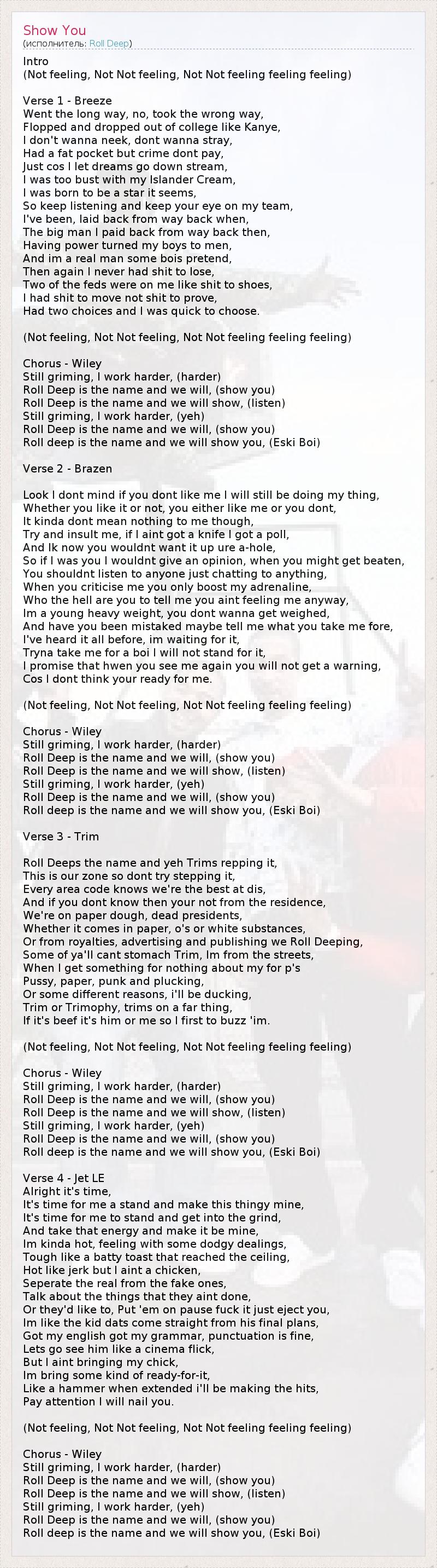Intro (Not feeling, Not Not feeling, Not Not feeling feeling feeling) Verse 1 - Breeze Went the long way, no, took the wrong way, Flopped and dropped out of college like Kanye, I don't wanna neek, dont wanna stray, Had a fat pocket but crime dont pay, Just cos I let dreams go down stream, I was too bust with my Islander Cream, I was born to be a star it seems, So keep listening and keep your eye on my team, I've been, laid back from way back when, The big man I paid back from way back then, Having power turned my boys to men, And im a real man some bois pretend, Then again I never had shit to lose, Two of the feds were on me like shit to shoes, I had shit to move not shit to prove, Had two choices and I was quick to choose. (Not feeling, Not Not feeling, Not Not feeling feeling feeling) Chorus - Wiley Still griming, I work harder, (harder) Roll Deep is the name and we will, (show you) Roll Deep is the name and we will show, (listen) Still griming, I work harder, (yeh) Roll Deep is the name and we will, (show you) Roll deep is the name and we will show you, (Eski Boi) Verse 2 - Brazen Look I dont mind if you dont like me I will still be doing my thing, Whether you like it or not, you either like me or you dont, It kinda dont mean nothing to me though, Try and insult me, if I aint got a knife I got a poll, And Ik now you wouldnt want it up ure a-hole, So if I was you I wouldnt give an opinion, when you might get beaten, You shouldnt listen to anyone just chatting to anything, When you criticise me you only boost my adrenaline, Who the hell are you to tell me you aint feeling me anyway, Im a young heavy weight, you dont wanna get weighed, And have you been mistaked maybe tell me what you take me fore, I've heard it all before, im waiting for it, Tryna take me for a boi I will not stand for it, I promise that hwen you see me again you will not get a warning, Cos I dont think your ready for me. (Not feeling, Not Not feeling, Not Not feeling feeling feeling) Chorus - Wiley Still griming, I work harder, (harder) Roll Deep is the name and we will, (show you) Roll Deep is the name and we will show, (listen) Still griming, I work harder, (yeh) Roll Deep is the name and we will, (show you) Roll deep is the name and we will show you, (Eski Boi) Verse 3 - Trim Roll Deeps the name and yeh Trims repping it, This is our zone so dont try stepping it, Every area code knows we're the best at dis, And if you dont know then your not from the residence, We're on paper dough, dead presidents, Whether it comes in paper, o's or white substances, Or from royalties, advertising and publishing we Roll Deeping, Some of ya'll cant stomach Trim, Im from the streets, When I get something for nothing about my for p's Pussy, paper, punk and plucking, Or some different reasons, i'll be ducking, Trim or Trimophy, trims on a far thing, If it's beef it's him or me so I first to buzz 'im. (Not feeling, Not Not feeling, Not Not feeling feeling feeling) Chorus - Wiley Still griming, I work harder, (harder) Roll Deep is the name and we will, (show you) Roll Deep is the name and we will show, (listen) Still griming, I work harder, (yeh) Roll Deep is the name and we will, (show you) Roll deep is the name and we will show you, (Eski Boi) Verse 4 - Jet LE Alright it's time, It's time for me a stand and make this thingy mine, It's time for me to stand and get into the grind, And take that energy and make it be mine, Im kinda hot, feeling with some dodgy dealings, Tough like a batty toast that reached the ceiling, Hot like jerk but I aint a chicken, Seperate the real from the fake ones, Talk about the things that they aint done, Or they'd like to, Put 'em on pause fuck it just eject you, Im like the kid dats come straight from his final plans, Got my english got my grammar, punctuation is fine, Lets go see him like a cinema flick, But I aint bringing my chick, Im bring some kind of ready-for-it, Like a hammer when extended i'll be making the hits, Pay attention I will nail you. (Not feeling, Not Not feeling, Not Not feeling feeling feeling) Chorus - Wiley Still griming, I work harder, (harder) Roll Deep is the name and we will, (show you) Roll Deep is the name and we will show, (listen) Still griming, I work harder, (yeh) Roll Deep is the name and we will, (show you) Roll deep is the name and we will show you, (Eski Boi)
