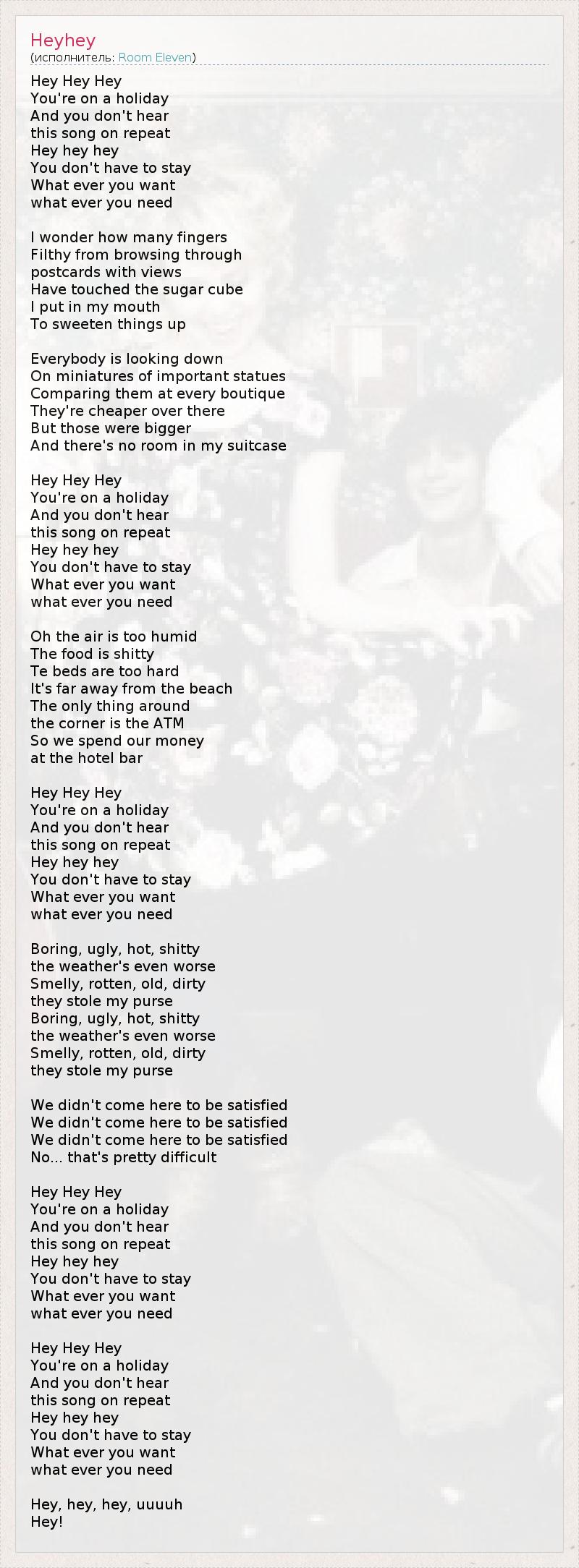 Hey Hey Hey You're on a holiday And you don't hear this song on repeat Hey hey hey You don't have to stay What ever you want what ever you need I wonder how many fingers Filthy from browsing through postcards with views Have touched the sugar cube I put in my mouth To sweeten things up Everybody is looking down On miniatures of important statues Comparing them at every boutique They're cheaper over there But those were bigger And there's no room in my suitcase Hey Hey Hey You're on a holiday And you don't hear this song on repeat Hey hey hey You don't have to stay What ever you want what ever you need Oh the air is too humid The food is shitty Te beds are too hard It's far away from the beach The only thing around the corner is the ATM So we spend our money at the hotel bar Hey Hey Hey You're on a holiday And you don't hear this song on repeat Hey hey hey You don't have to stay What ever you want what ever you need Boring, ugly, hot, shitty the weather's even worse Smelly, rotten, old, dirty they stole my purse Boring, ugly, hot, shitty the weather's even worse Smelly, rotten, old, dirty they stole my purse We didn't come here to be satisfied We didn't come here to be satisfied We didn't come here to be satisfied No... that's pretty difficult Hey Hey Hey You're on a holiday And you don't hear this song on repeat Hey hey hey You don't have to stay What ever you want what ever you need Hey Hey Hey You're on a holiday And you don't hear this song on repeat Hey hey hey You don't have to stay What ever you want what ever you need Hey, hey, hey, uuuuh Hey!