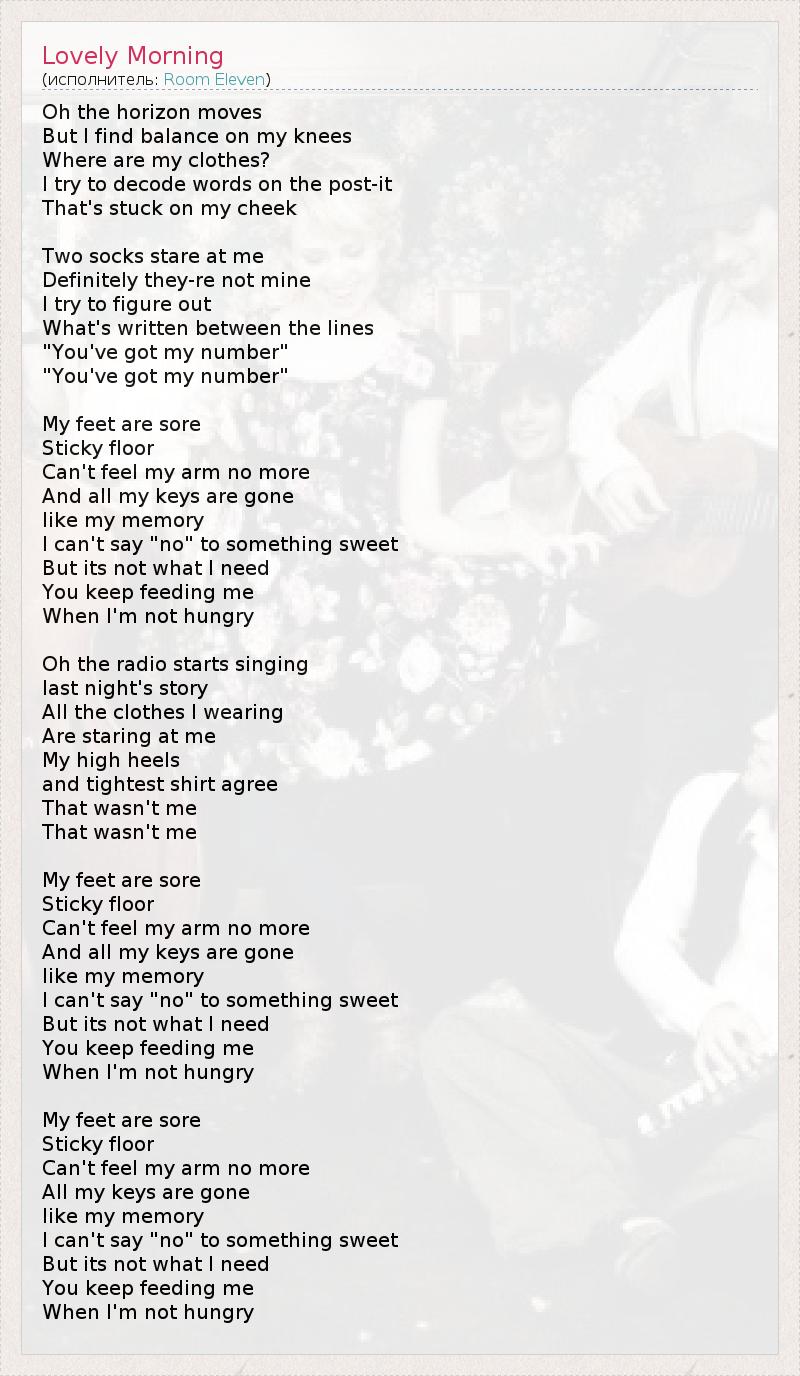 Oh the horizon moves But I find balance on my knees Where are my clothes? I try to decode words on the post-it That's stuck on my cheek Two socks stare at me Definitely they-re not mine I try to figure out What's written between the lines "You've got my number" "You've got my number" My feet are sore Sticky floor Can't feel my arm no more And all my keys are gone like my memory I can't say "no" to something sweet But its not what I need You keep feeding me When I'm not hungry Oh the radio starts singing last night's story All the clothes I wearing Are staring at me My high heels and tightest shirt agree That wasn't me That wasn't me My feet are sore Sticky floor Can't feel my arm no more And all my keys are gone like my memory I can't say "no" to something sweet But its not what I need You keep feeding me When I'm not hungry My feet are sore Sticky floor Can't feel my arm no more All my keys are gone like my memory I can't say "no" to something sweet But its not what I need You keep feeding me When I'm not hungry