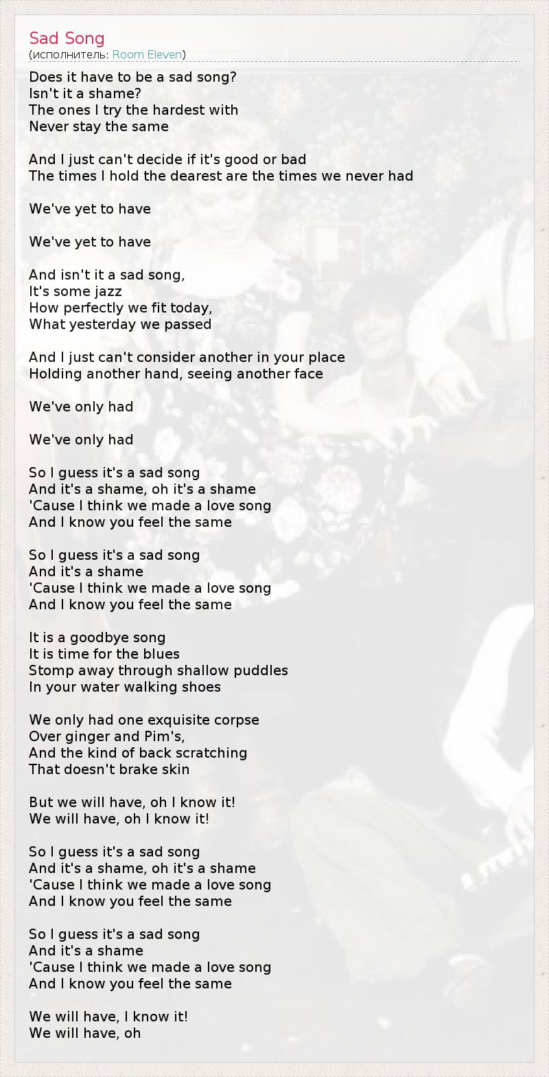 Does it have to be a sad song? Isn't it a shame? The ones I try the hardest with Never stay the same And I just can't decide if it's good or bad The times I hold the dearest are the times we never had We've yet to have We've yet to have And isn't it a sad song, It's some jazz How perfectly we fit today, What yesterday we passed And I just can't consider another in your place Holding another hand, seeing another face We've only had We've only had So I guess it's a sad song And it's a shame, oh it's a shame 'Cause I think we made a love song And I know you feel the same So I guess it's a sad song And it's a shame 'Cause I think we made a love song And I know you feel the same It is a goodbye song It is time for the blues Stomp away through shallow puddles In your water walking shoes We only had one exquisite corpse Over ginger and Pim's, And the kind of back scratching That doesn't brake skin But we will have, oh I know it! We will have, oh I know it! So I guess it's a sad song And it's a shame, oh it's a shame 'Cause I think we made a love song And I know you feel the same So I guess it's a sad song And it's a shame 'Cause I think we made a love song And I know you feel the same We will have, I know it! We will have, oh