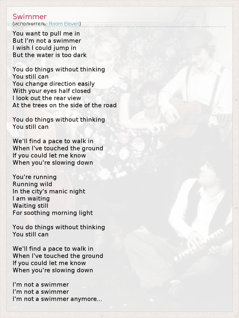 You want to pull me in But I'm not a swimmer I wish I could jump in But the water is too dark You do things without thinking You still can You change direction easily With your eyes half closed I look out the rear view At the trees on the side of the road You do things without thinking You still can We'll find a pace to walk in When I've touched the ground If you could let me know When you're slowing down You're running Running wild In the city's manic night I am waiting Waiting still For soothing morning light You do things without thinking You still can We'll find a pace to walk in When I've touched the ground If you could let me know When you're slowing down I'm not a swimmer I'm not a swimmer I'm not a swimmer anymore...