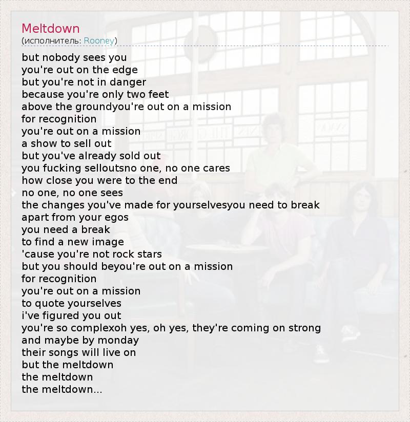 but nobody sees you you're out on the edge but you're not in danger because you're only two feet above the groundyou're out on a mission for recognition you're out on a mission a show to sell out but you've already sold out you fucking selloutsno one, no one cares how close you were to the end no one, no one sees the changes you've made for yourselvesyou need to break apart from your egos you need a break to find a new image 'cause you're not rock stars but you should beyou're out on a mission for recognition you're out on a mission to quote yourselves i've figured you out you're so complexoh yes, oh yes, they're coming on strong and maybe by monday their songs will live on but the meltdown the meltdown the meltdown...