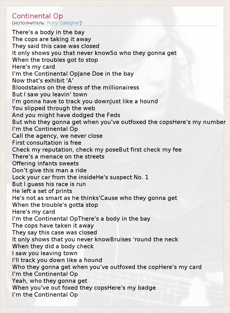 There's a body in the bay The cops are taking it away They said this case was closed It only shows you that never knowSo who they gonna get When the troubles got to stop Here's my card I'm the Continental OpJane Doe in the bay Now that's exhibit 'A' Bloodstains on the dress of the millionairess But I saw you leavin' town I'm gonna have to track you downJust like a hound You slipped through the web And you might have dodged the Feds But who they gonna get when you've outfoxed the copsHere's my number I'm the Continental Op Call the agency, we never close First consultation is free Check my reputation, check my poseBut first check my fee There's a menace on the streets Offering infants sweets Don't give this man a ride Lock your car from the insideHe's suspect No. 1 But I guess his race is run He left a set of prints He's not as smart as he thinks'Cause who they gonna get When the trouble's gotta stop Here's my card I'm the Continental OpThere's a body in the bay The cops have taken it away They say this case was closed It only shows that you never knowBruises 'round the neck When they did a body check I saw you leaving town I'll track you down like a hound Who they gonna get when you've outfoxed the copHere's my card I'm the Continental Op Yeah, who they gonna get When you've out foxed they copsHere's my badge I'm the Continental Op