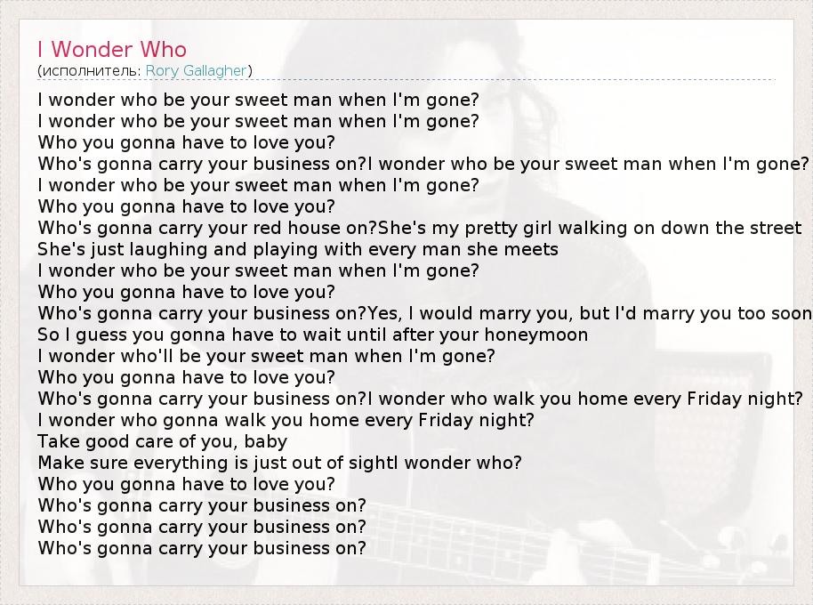 I wonder who be your sweet man when I'm gone? I wonder who be your sweet man when I'm gone? Who you gonna have to love you? Who's gonna carry your business on?I wonder who be your sweet man when I'm gone? I wonder who be your sweet man when I'm gone? Who you gonna have to love you? Who's gonna carry your red house on?She's my pretty girl walking on down the street She's just laughing and playing with every man she meets I wonder who be your sweet man when I'm gone? Who you gonna have to love you? Who's gonna carry your business on?Yes, I would marry you, but I'd marry you too soon So I guess you gonna have to wait until after your honeymoon I wonder who'll be your sweet man when I'm gone? Who you gonna have to love you? Who's gonna carry your business on?I wonder who walk you home every Friday night? I wonder who gonna walk you home every Friday night? Take good care of you, baby Make sure everything is just out of sightI wonder who? Who you gonna have to love you? Who's gonna carry your business on? Who's gonna carry your business on? Who's gonna carry your business on?