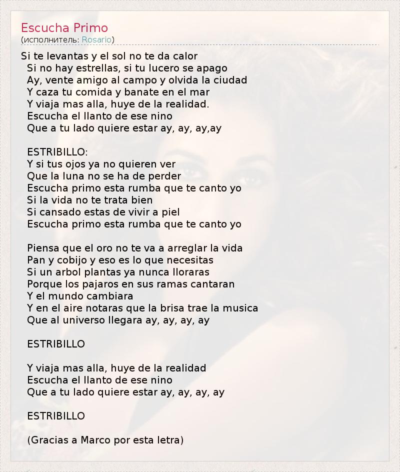 Si te levantas y el sol no te da calor Si no hay estrellas, si tu lucero se apago Ay, vente amigo al campo y olvida la ciudad Y caza tu comida y banate en el mar Y viaja mas alla, huye de la realidad. Escucha el llanto de ese nino Que a tu lado quiere estar ay, ay, ay,ay ESTRIBILLO: Y si tus ojos ya no quieren ver Que la luna no se ha de perder Escucha primo esta rumba que te canto yo Si la vida no te trata bien Si cansado estas de vivir a piel Escucha primo esta rumba que te canto yo Piensa que el oro no te va a arreglar la vida Pan y cobijo y eso es lo que necesitas Si un arbol plantas ya nunca lloraras Porque los pajaros en sus ramas cantaran Y el mundo cambiara Y en el aire notaras que la brisa trae la musica Que al universo llegara ay, ay, ay, ay ESTRIBILLO Y viaja mas alla, huye de la realidad Escucha el llanto de ese nino Que a tu lado quiere estar ay, ay, ay, ay ESTRIBILLO (Gracias a Marco por esta letra)