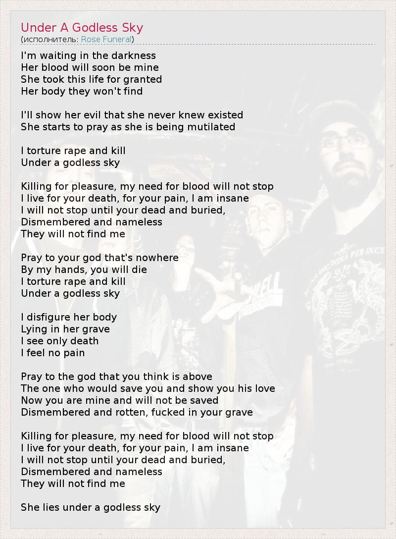 I'm waiting in the darkness Her blood will soon be mine She took this life for granted Her body they won't find I'll show her evil that she never knew existed She starts to pray as she is being mutilated I torture rape and kill Under a godless sky Killing for pleasure, my need for blood will not stop I live for your death, for your pain, I am insane I will not stop until your dead and buried, Dismembered and nameless They will not find me Pray to your god that's nowhere By my hands, you will die I torture rape and kill Under a godless sky I disfigure her body Lying in her grave I see only death I feel no pain Pray to the god that you think is above The one who would save you and show you his love Now you are mine and will not be saved Dismembered and rotten, fucked in your grave Killing for pleasure, my need for blood will not stop I live for your death, for your pain, I am insane I will not stop until your dead and buried, Dismembered and nameless They will not find me She lies under a godless sky