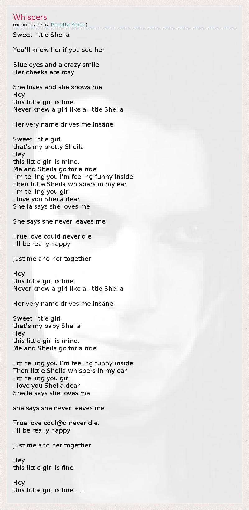Sweet little Sheila You'll know her if you see her Blue eyes and a crazy smile Her cheeks are rosy She loves and she shows me Hey this little girl is fine. Never knew a girl like a little Sheila Her very name drives me insane Sweet little girl that's my pretty Sheila Hey this little girl is mine. Me and Sheila go for a ride I'm telling you I'm feeling funny inside: Then little Sheila whispers in my ear I'm telling you girl I love you Sheila dear Sheila says she loves me She says she never leaves me True love could never die I'll be really happy just me and her together Hey this little girl is fine. Never knew a girl like a little Sheila Her very name drives me insane Sweet little girl that's my baby Sheila Hey this little girl is mine. Me and Sheila go for a ride I'm telling you I'm feeling funny inside; Then little Sheila whispers in my ear I'm telling you girl I love you Sheila dear Sheila says she loves me she says she never leaves me True love coul@d never die. I'll be really happy just me and her together Hey this little girl is fine Hey this little girl is fine . . .