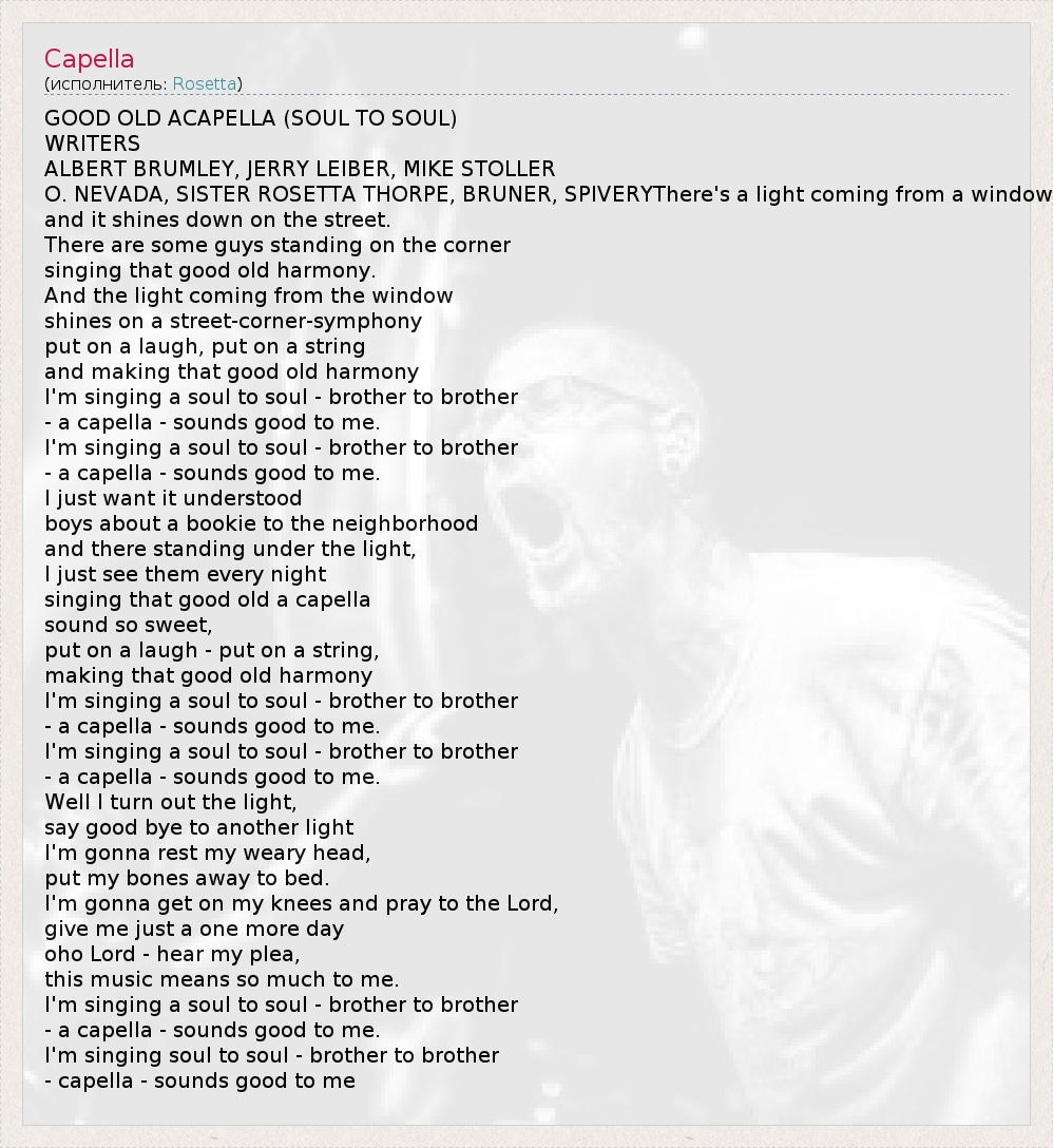 GOOD OLD ACAPELLA (SOUL TO SOUL) WRITERS ALBERT BRUMLEY, JERRY LEIBER, MIKE STOLLER O. NEVADA, SISTER ROSETTA THORPE, BRUNER, SPIVERYThere's a light coming from a window and it shines down on the street. There are some guys standing on the corner singing that good old harmony. And the light coming from the window shines on a street-corner-symphony put on a laugh, put on a string and making that good old harmony I'm singing a soul to soul - brother to brother - a capella - sounds good to me. I'm singing a soul to soul - brother to brother - a capella - sounds good to me. I just want it understood boys about a bookie to the neighborhood and there standing under the light, I just see them every night singing that good old a capella sound so sweet, put on a laugh - put on a string, making that good old harmony I'm singing a soul to soul - brother to brother - a capella - sounds good to me. I'm singing a soul to soul - brother to brother - a capella - sounds good to me. Well I turn out the light, say good bye to another light I'm gonna rest my weary head, put my bones away to bed. I'm gonna get on my knees and pray to the Lord, give me just a one more day oho Lord - hear my plea, this music means so much to me. I'm singing a soul to soul - brother to brother - a capella - sounds good to me. I'm singing soul to soul - brother to brother - capella - sounds good to me