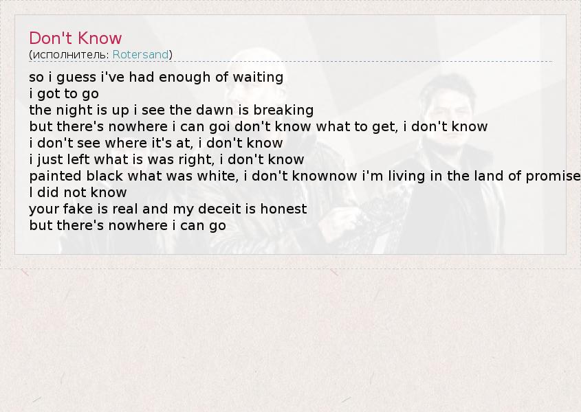 so i guess i've had enough of waiting i got to go the night is up i see the dawn is breaking but there's nowhere i can goi don't know what to get, i don't know i don't see where it's at, i don't know i just left what is was right, i don't know painted black what was white, i don't knownow i'm living in the land of promise I did not know your fake is real and my deceit is honest but there's nowhere i can go