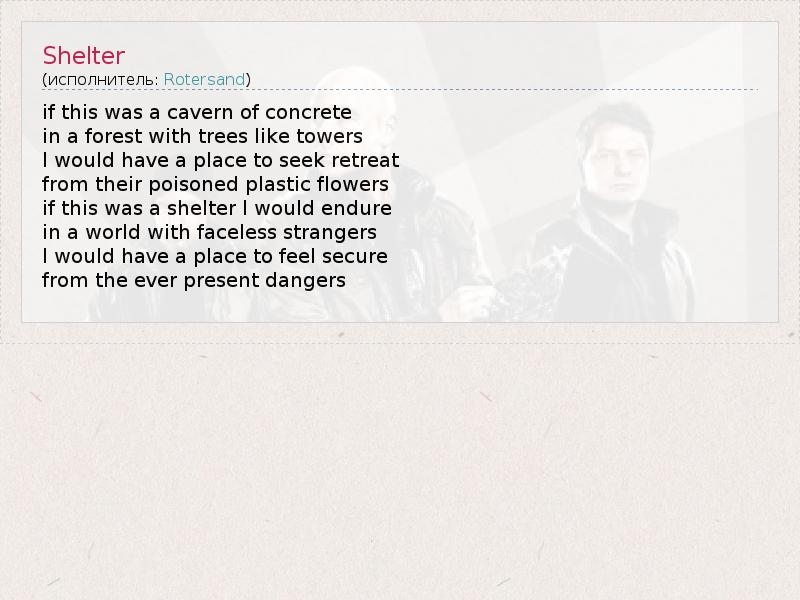if this was a cavern of concrete in a forest with trees like towers I would have a place to seek retreat from their poisoned plastic flowers if this was a shelter I would endure in a world with faceless strangers I would have a place to feel secure from the ever present dangers