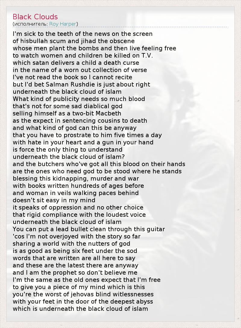 I'm sick to the teeth of the news on the screen of hisbullah scum and jihad the obscene whose men plant the bombs and then live feeling free to watch women and children be killed on T.V. which satan delivers a child a death curse in the name of a worn out collection of verse I've not read the book so I cannot recite but I'd bet Salman Rushdie is just about right underneath the black cloud of islam What kind of publicity needs so much blood that's not for some sad diablical god selling himself as a two-bit Macbeth as the expect in sentencing cousins to death and what kind of god can this be anyway that you have to prostrate to him five times a day with hate in your heart and a gun in your hand is force the only thing to understand underneath the black cloud of islam? and the butchers who've got all this blood on their hands are the ones who need god to be stood where he stands blessing this kidnapping, murder and war with books written hundreds of ages before and woman in veils walking paces behind doesn't sit easy in my mind it speaks of oppression and no other choice that rigid compliance with the loudest voice underneath the black cloud of islam You can put a lead bullet clean through this guitar 'cos I'm not overjoyed with the story so far sharing a world with the nutters of god is as good as being six feet under the sod words that are written are all here to say and these are the latest there are anyway and I am the prophet so don't believe me I'm the same as the old ones expect that I'm free to give you a piece of my mind which is this you're the worst of jehovas blind witlessnesses with your feet in the door of the deepest abyss which is underneath the black cloud of islam
