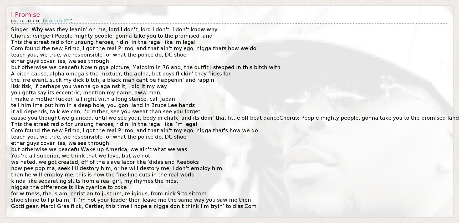 Это интересно:Royce Da 5'9'' также известный как Nickel-Nine и King of Detroit, настоящее имя Ryan Montgomery, родился 5-го июля 1977-го года в Детройте. Его относят к таким жанрам, как Freestyle Rap, Battle Rap, Detroit Hip Hop. Он сотрудничал с такими звукозаписывающими лейблами, как Tommy Boy, Game Recordings, Columbia, M.I.C. и Trouble Records. Он создавал свою музыку под влиянием творчества Dr. Dre и N.W.A. Свой первый контракт рэпер подписал с Tommy Boy Records в 1998-м году,... продолжение