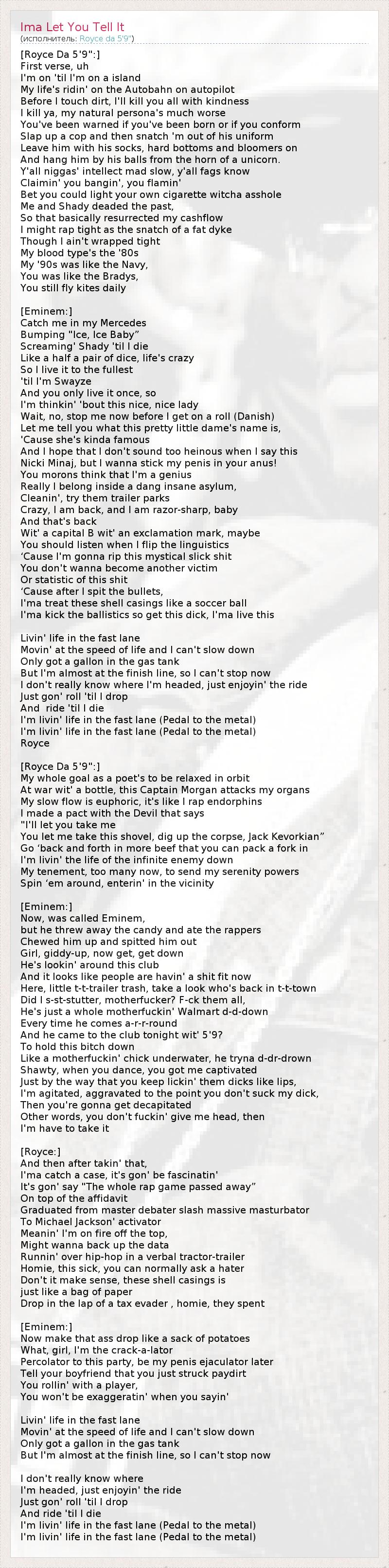 [Royce Da 5'9":] First verse, uh I'm on 'til I'm on a island My life's ridin' on the Autobahn on autopilot Before I touch dirt, I'll kill you all with kindness I kill ya, my natural persona's much worse You've been warned if you've been born or if you conform Slap up a cop and then snatch 'm out of his uniform Leave him with his socks, hard bottoms and bloomers on And hang him by his balls from the horn of a unicorn. Y'all niggas' intellect mad slow, y'all fags know Claimin' you bangin', you flamin' Bet you could light your own cigarette witcha asshole Me and Shady deaded the past, So that basically resurrected my cashflow I might rap tight as the snatch of a fat dyke Though I ain't wrapped tight My blood type's the '80s My '90s was like the Navy, You was like the Bradys, You still fly kites daily [Eminem:] Catch me in my Mercedes Bumping "Ice, Ice Baby” Screaming' Shady 'til I die Like a half a pair of dice, life's crazy So I live it to the fullest 'til I'm Swayze And you only live it once, so I'm thinkin' 'bout this nice, nice lady Wait, no, stop me now before I get on a roll (Danish) Let me tell you what this pretty little dame's name is, 'Cause she's kinda famous And I hope that I don't sound too heinous when I say this Nicki Minaj, but I wanna stick my penis in your anus! You morons think that I'm a genius Really I belong inside a dang insane asylum, Cleanin', try them trailer parks Crazy, I am back, and I am razor-sharp, baby And that's back Wit' a capital B wit' an exclamation mark, maybe You should listen when I flip the linguistics ‘Cause I'm gonna rip this mystical slick shit You don't wanna become another victim Оr statistic of this shit ‘Cause after I spit the bullets, I'ma treat these shell casings like a soccer ball I'ma kick the ballistics so get this dick, I'ma live this Livin' life in the fast lane Movin' at the speed of life and I can't slow down Only got a gallon in the gas tank But I'm almost at the finish line, so I can't stop now I don't really know where I'm headed, just enjoyin' the ride Just gon' roll 'til I drop And ride 'til I die I'm livin' life in the fast lane (Pedal to the metal) I'm livin' life in the fast lane (Pedal to the metal) Royce [Royce Da 5'9":] My whole goal as a poet's to be relaxed in orbit At war wit' a bottle, this Captain Morgan attacks my organs My slow flow is euphoric, it's like I rap endorphins I made a pact with the Devil that says "I'll let you take me You let me take this shovel, dig up the corpse, Jack Kevorkian” Go ‘back and forth in more beef that you can pack a fork in I'm livin' the life of the infinite enemy down My tenement, too many now, to send my serenity powers Spin ‘em around, enterin' in the vicinity [Eminem:] Now, was called Eminem, but he threw away the candy and ate the rappers Chewed him up and spitted him out Girl, giddy-up, now get, get down He's lookin' around this club And it looks like people are havin' a shit fit now Here, little t-t-trailer trash, take a look who's back in t-t-town Did I s-st-stutter, motherfucker? F-ck them all, He's just a whole motherfuckin' Walmart d-d-down Every time he comes a-r-r-round And he came to the club tonight wit' 5'9? To hold this bitch down Like a motherfuckin' chick underwater, he tryna d-dr-drown Shawty, when you dance, you got me captivated Just by the way that you keep lickin' them dicks like lips, I'm agitated, aggravated to the point you don't suck my dick, Then you're gonna get decapitated Other words, you don't fuckin' give me head, then I'm have to take it [Royce:] And then after takin' that, I'ma catch a case, it's gon' be fascinatin' It's gon' say "The whole rap game passed away” Оn top of the affidavit Graduated from master debater slash massive masturbator To Michael Jackson' activator Meanin' I'm on fire off the top, Мight wanna back up the data Runnin' over hip-hop in a verbal tractor-trailer Homie, this sick, you can normally ask a hater Don't it make sense, these shell casings is just like a bag of paper Drop in the lap of a tax evader , homie, they spent [Eminem:] Now make that ass drop like a sack of potatoes What, girl, I'm the crack-a-lator Percolator to this party, be my penis ejaculator later Tell your boyfriend that you just struck paydirt You rollin' with a player, You won't be exaggeratin' when you sayin' Livin' life in the fast lane Movin' at the speed of life and I can't slow down Only got a gallon in the gas tank But I'm almost at the finish line, so I can't stop now I don't really know where I'm headed, just enjoyin' the ride Just gon' roll 'til I drop And ride 'til I die I'm livin' life in the fast lane (Pedal to the metal) I'm livin' life in the fast lane (Pedal to the metal)