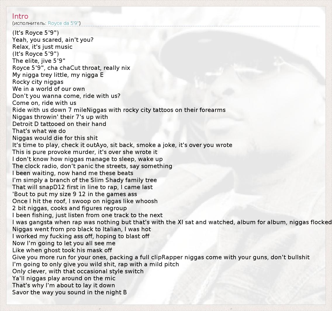 (It's Royce 5'9") Yeah, you scared, ain't you? Relax, it's just music (It's Royce 5'9") The elite, jive 5'9" Royce 5'9", cha chaCut throat, really nix My nigga trey little, my nigga E Rocky city niggas We in a world of our own Don't you wanna come, ride with us? Come on, ride with us Ride with us down 7 mileNiggas with rocky city tattoos on their forearms Niggas throwin' their 7's up with Detroit D tattooed on their hand That's what we do Niggas would die for this shit It's time to play, check it outAyo, sit back, smoke a joke, it's over you wrote This is pure provoke murder, it's over she wrote it I don't know how niggas manage to sleep, wake up The clock radio, don't panic the streets, say something I been waiting, now hand me these beats I'm simply a branch of the Slim Shady family tree That will snapD12 first in line to rap, I came last 'Bout to put my size 9 12 in the games ass Once I hit the roof, I swoop on niggas like whoosh 2 bit niggas, cooks and figures regroup I been fishing, just listen from one track to the next I was gangsta when rap was nothing but that's with the XI sat and watched, album for album, niggas flocked Niggas went from pro black to Italian, I was hot I worked my fucking ass off, hoping to blast off Now I'm going to let you all see me Like when ghost took his mask off Give you more run for your ones, packing a full clipRapper niggas come with your guns, don't bullshit I'm going to only give you wild shit, rap with a mild pitch Only clever, with that occasional style switch Ya'll niggas play around on the mic That's why I'm about to lay it down Savor the way you sound in the night B