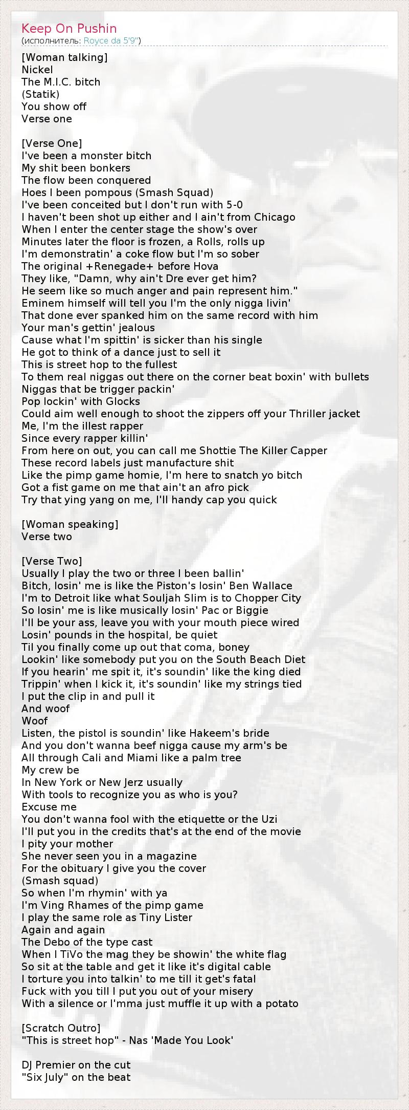 Это интересно:Royce Da 5'9'' также известный как Nickel-Nine и King of Detroit, настоящее имя Ryan Montgomery, родился 5-го июля 1977-го года в Детройте. Его относят к таким жанрам, как Freestyle Rap, Battle Rap, Detroit Hip Hop. Он сотрудничал с такими звукозаписывающими лейблами, как Tommy Boy, Game Recordings, Columbia, M.I.C. и Trouble Records. Он создавал свою музыку под влиянием творчества Dr. Dre и N.W.A. Свой первый контракт рэпер подписал с Tommy Boy Records в 1998-м году,... продолжение