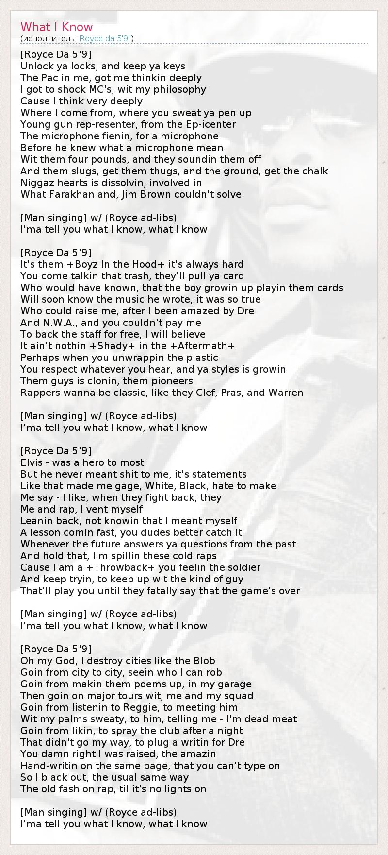 [Royce Da 5'9] Unlock ya locks, and keep ya keys The Pac in me, got me thinkin deeply I got to shock MC's, wit my philosophy Cause I think very deeply Where I come from, where you sweat ya pen up Young gun rep-resenter, from the Ep-icenter The microphone fienin, for a microphone Before he knew what a microphone mean Wit them four pounds, and they soundin them off And them slugs, get them thugs, and the ground, get the chalk Niggaz hearts is dissolvin, involved in What Farakhan and, Jim Brown couldn't solve [Man singing] w/ (Royce ad-libs) I'ma tell you what I know, what I know [Royce Da 5'9] It's them +Boyz In the Hood+ it's always hard You come talkin that trash, they'll pull ya card Who would have known, that the boy growin up playin them cards Will soon know the music he wrote, it was so true Who could raise me, after I been amazed by Dre And N.W.A., and you couldn't pay me To back the staff for free, I will believe It ain't nothin +Shady+ in the +Aftermath+ Perhaps when you unwrappin the plastic You respect whatever you hear, and ya styles is growin Them guys is clonin, them pioneers Rappers wanna be classic, like they Clef, Pras, and Warren [Man singing] w/ (Royce ad-libs) I'ma tell you what I know, what I know [Royce Da 5'9] Elvis - was a hero to most But he never meant shit to me, it's statements Like that made me gage, White, Black, hate to make Me say - I like, when they fight back, they Me and rap, I vent myself Leanin back, not knowin that I meant myself A lesson comin fast, you dudes better catch it Whenever the future answers ya questions from the past And hold that, I'm spillin these cold raps Cause I am a +Throwback+ you feelin the soldier And keep tryin, to keep up wit the kind of guy That'll play you until they fatally say that the game's over [Man singing] w/ (Royce ad-libs) I'ma tell you what I know, what I know [Royce Da 5'9] Oh my God, I destroy cities like the Blob Goin from city to city, seein who I can rob Goin from makin them poems up, in my garage Then goin on major tours wit, me and my squad Goin from listenin to Reggie, to meeting him Wit my palms sweaty, to him, telling me - I'm dead meat Goin from likin, to spray the club after a night That didn't go my way, to plug a writin for Dre You damn right I was raised, the amazin Hand-writin on the same page, that you can't type on So I black out, the usual same way The old fashion rap, til it's no lights on [Man singing] w/ (Royce ad-libs) I'ma tell you what I know, what I know