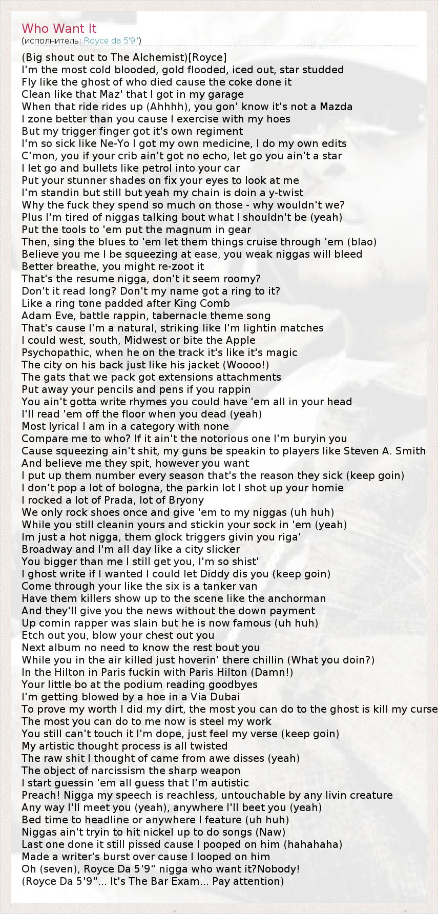 (Big shout out to The Alchemist)[Royce] I'm the most cold blooded, gold flooded, iced out, star studded Fly like the ghost of who died cause the coke done it Clean like that Maz' that I got in my garage When that ride rides up (Ahhhh), you gon' know it's not a Mazda I zone better than you cause I exercise with my hoes But my trigger finger got it's own regiment I'm so sick like Ne-Yo I got my own medicine, I do my own edits C'mon, you if your crib ain't got no echo, let go you ain't a star I let go and bullets like petrol into your car Put your stunner shades on fix your eyes to look at me I'm standin but still but yeah my chain is doin a y-twist Why the fuck they spend so much on those - why wouldn't we? Plus I'm tired of niggas talking bout what I shouldn't be (yeah) Put the tools to 'em put the magnum in gear Then, sing the blues to 'em let them things cruise through 'em (blao) Believe you me I be squeezing at ease, you weak niggas will bleed Better breathe, you might re-zoot it That's the resume nigga, don't it seem roomy? Don't it read long? Don't my name got a ring to it? Like a ring tone padded after King Comb Adam Eve, battle rappin, tabernacle theme song That's cause I'm a natural, striking like I'm lightin matches I could west, south, Midwest or bite the Apple Psychopathic, when he on the track it's like it's magic The city on his back just like his jacket (Woooo!) The gats that we pack got extensions attachments Put away your pencils and pens if you rappin You ain't gotta write rhymes you could have 'em all in your head I'll read 'em off the floor when you dead (yeah) Most lyrical I am in a category with none Compare me to who? If it ain't the notorious one I'm buryin you Cause squeezing ain't shit, my guns be speakin to players like Steven A. Smith And believe me they spit, however you want I put up them number every season that's the reason they sick (keep goin) I don't pop a lot of bologna, the parkin lot I shot up your homie I rocked a lot of Prada, lot of Bryony We only rock shoes once and give 'em to my niggas (uh huh) While you still cleanin yours and stickin your sock in 'em (yeah) Im just a hot nigga, them glock triggers givin you riga' Broadway and I'm all day like a city slicker You bigger than me I still get you, I'm so shist' I ghost write if I wanted I could let Diddy dis you (keep goin) Come through your like the six is a tanker van Have them killers show up to the scene like the anchorman And they'll give you the news without the down payment Up comin rapper was slain but he is now famous (uh huh) Etch out you, blow your chest out you Next album no need to know the rest bout you While you in the air killed just hoverin' there chillin (What you doin?) In the Hilton in Paris fuckin with Paris Hilton (Damn!) Your little bo at the podium reading goodbyes I'm getting blowed by a hoe in a Via Dubai To prove my worth I did my dirt, the most you can do to the ghost is kill my curse The most you can do to me now is steel my work You still can't touch it I'm dope, just feel my verse (keep goin) My artistic thought process is all twisted The raw shit I thought of came from awe disses (yeah) The object of narcissism the sharp weapon I start guessin 'em all guess that I'm autistic Preach! Nigga my speech is reachless, untouchable by any livin creature Any way I'll meet you (yeah), anywhere I'll beet you (yeah) Bed time to headline or anywhere I feature (uh huh) Niggas ain't tryin to hit nickel up to do songs (Naw) Last one done it still pissed cause I pooped on him (hahahaha) Made a writer's burst over cause I looped on him Oh (seven), Royce Da 5'9" nigga who want it?Nobody! (Royce Da 5'9"... It's The Bar Exam... Pay attention)