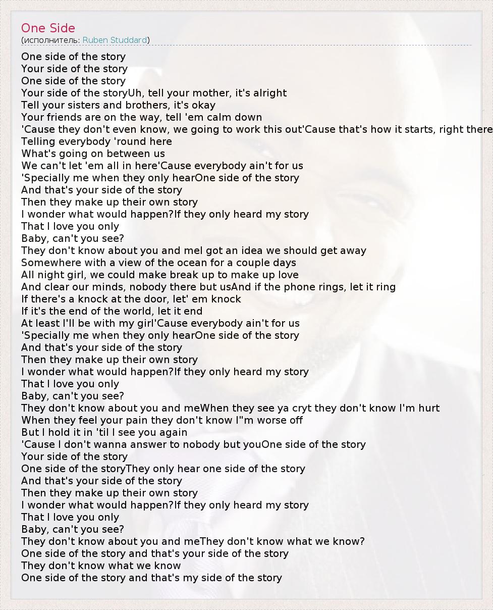'Cause I don't wanna answer to nobody but youOne side of the story