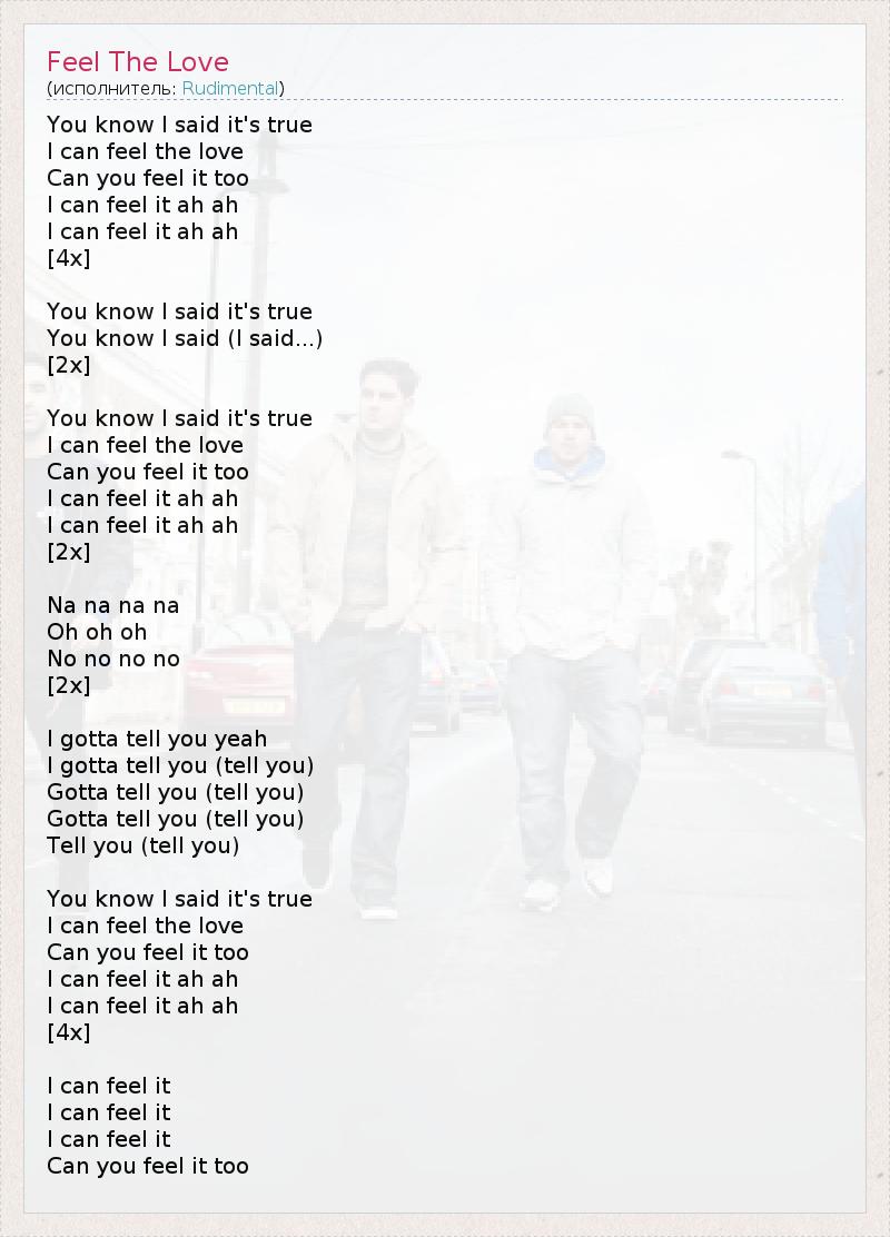 Знаешь, ведь я сказал, что это правда, Я чувствую любовь, Ты тоже её чувствуешь? Я её чувствую... Я её чувствую... [4x] Знаешь, ведь я сказал, что это правда, Знаешь, ведь я сказал... (ведь я сказал...) [2x] Знаешь, ведь я сказал, что это правда, Я чувствую любовь, Ты тоже её чувствуешь? Я её чувствую... Я её чувствую... [2x] На на на на... Оу оу оу... Но но но но... [2x] Я должен сказать тебе, да, Я должен сказать тебе, (сказать тебе) Должен сказать тебе, (сказать тебе) Должен сказать тебе, (сказать тебе) Сказать тебе... (сказать тебе) Знаешь, ведь я сказал, что это правда, Я чувствую любовь, Ты тоже её чувствуешь? Я её чувствую... Я её чувствую... [4x] Я её чувствую... Я её чувствую... Я её чувствую... Ты тоже её чувствуешь?