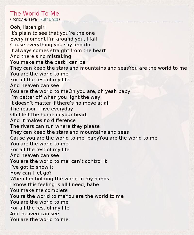 Ooh, listen girl It's plain to see that you're the one Every moment I'm around you, I fall Cause everything you say and do It always comes straight from the heart And there's no mistaking You make me the best I can be They can keep the stars and mountains and seasYou are the world to me You are the world to me For all the rest of my life And heaven can see You are the world to meOh you are, oh yeah baby I'm better off when you light the way It doesn't matter if there's no move at all The reason I live everyday Oh I felt the home in your heart And it makes no difference The rivers can run where they please They can keep the stars and mountains and seas Cause you are the world to me, babyYou are the world to me You are the world to me For all the rest of my life And heaven can see You are the world to meI can't control it I've got to show it How can I let go? When I'm holding the world in my hands I know this feeling is all I need, babe You make me complete You're the world to meYou are the world to me You are the world to me For all the rest of my life And heaven can see You are the world to me
