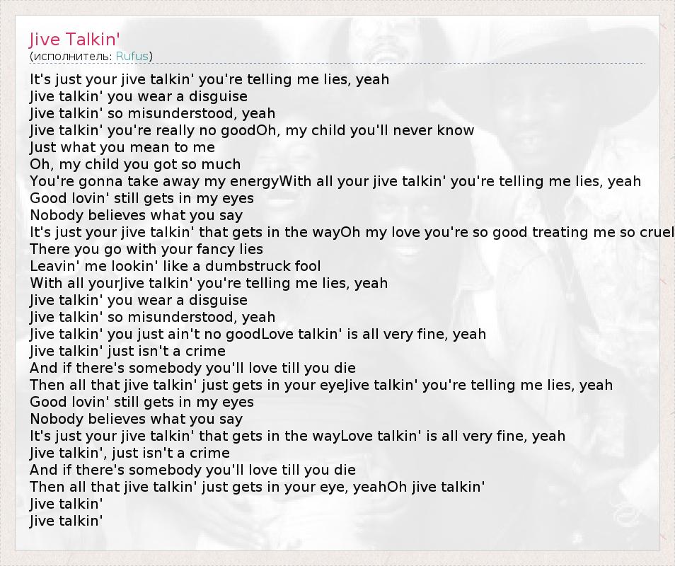 It's just your jive talkin' you're telling me lies, yeah Jive talkin' you wear a disguise Jive talkin' so misunderstood, yeah Jive talkin' you're really no goodOh, my child you'll never know Just what you mean to me Oh, my child you got so much You're gonna take away my energyWith all your jive talkin' you're telling me lies, yeah Good lovin' still gets in my eyes Nobody believes what you say It's just your jive talkin' that gets in the wayOh my love you're so good treating me so cruel There you go with your fancy lies Leavin' me lookin' like a dumbstruck fool With all yourJive talkin' you're telling me lies, yeah Jive talkin' you wear a disguise Jive talkin' so misunderstood, yeah Jive talkin' you just ain't no goodLove talkin' is all very fine, yeah Jive talkin' just isn't a crime And if there's somebody you'll love till you die Then all that jive talkin' just gets in your eyeJive talkin' you're telling me lies, yeah Good lovin' still gets in my eyes Nobody believes what you say It's just your jive talkin' that gets in the wayLove talkin' is all very fine, yeah Jive talkin', just isn't a crime And if there's somebody you'll love till you die Then all that jive talkin' just gets in your eye, yeahOh jive talkin' Jive talkin' Jive talkin'