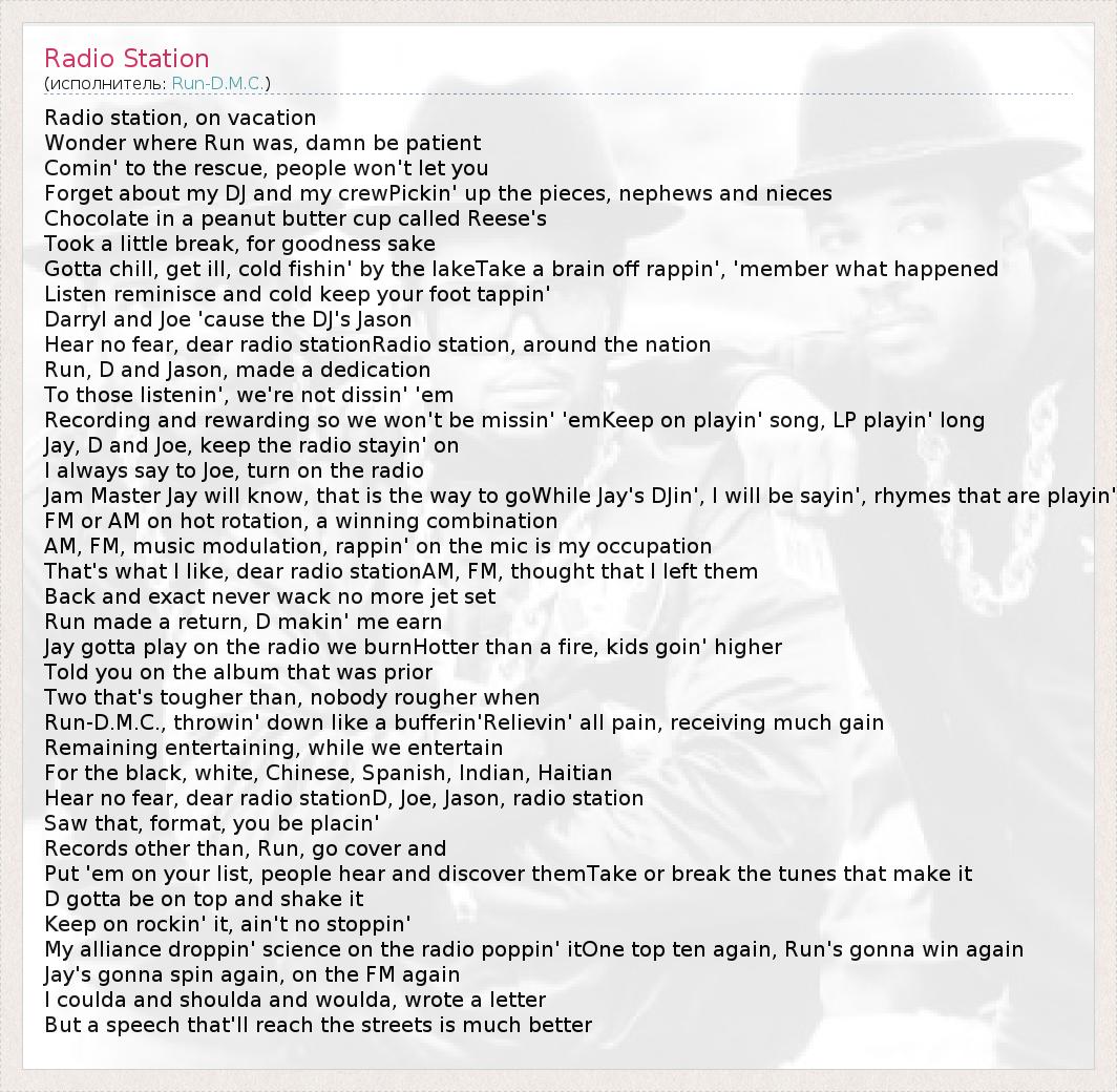 Это интересно:Run-D.M.C. («Ран Ди-Эм-Си») — американская рэп-группа, которая, наряду с Public Enemy и N.W.A, занимала доминирующее положение в хип-хопе 1980-х. Более, чем любая другая рэп-группа, Run-D.M.C. оказали влияние на звучание и стиль современного хип-хопа. Первыми среди рэперов они смогли пробиться в мейнстрим: их видеоклипы показывали на MTV, а синглы ротировались в поп-чартах.С... продолжение